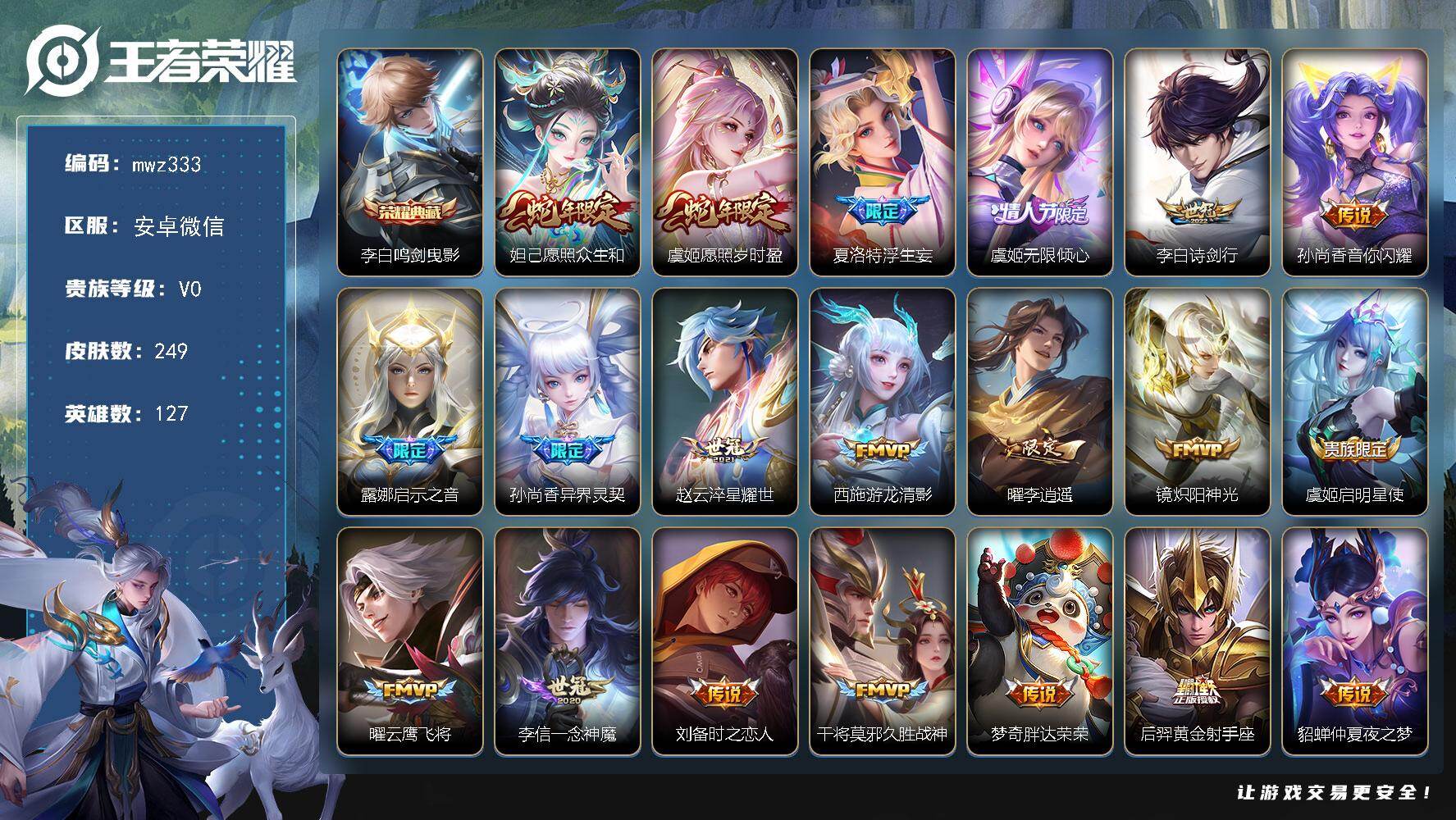 【mwz333】安卓WX-V0-最强王者段位-127英雄-249皮肤-1典藏皮