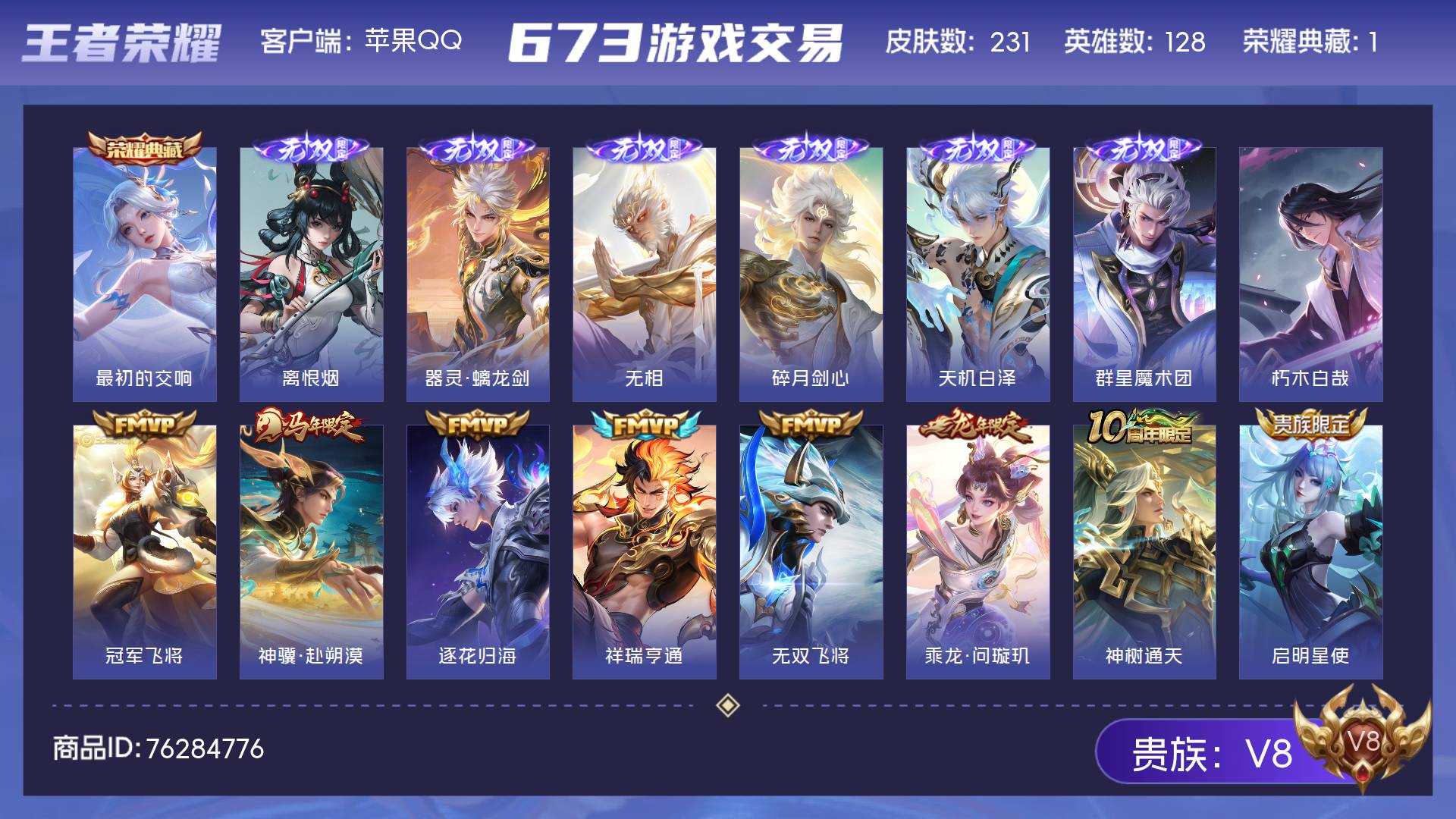 V8 皮肤231 英雄128 非凡王者 荣耀典藏1 无双皮肤6 珍品传说1 传说24