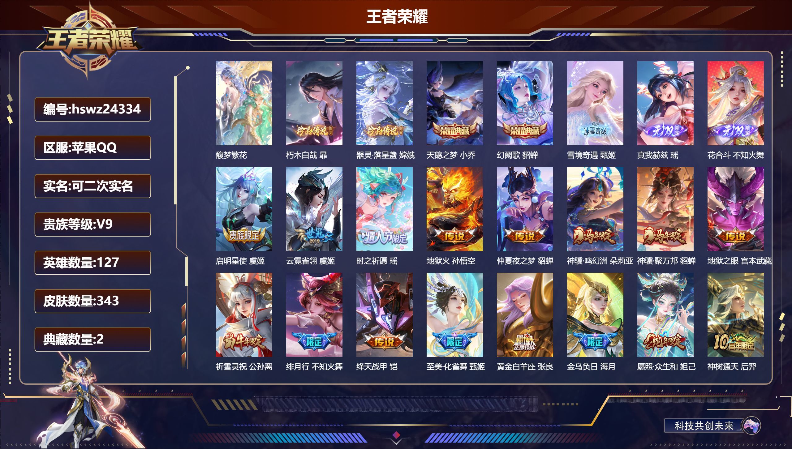 苹果QQ/非凡王者/343皮肤/127英雄/2典藏/1珍品无双/3无双/2珍品传说/17传说/113