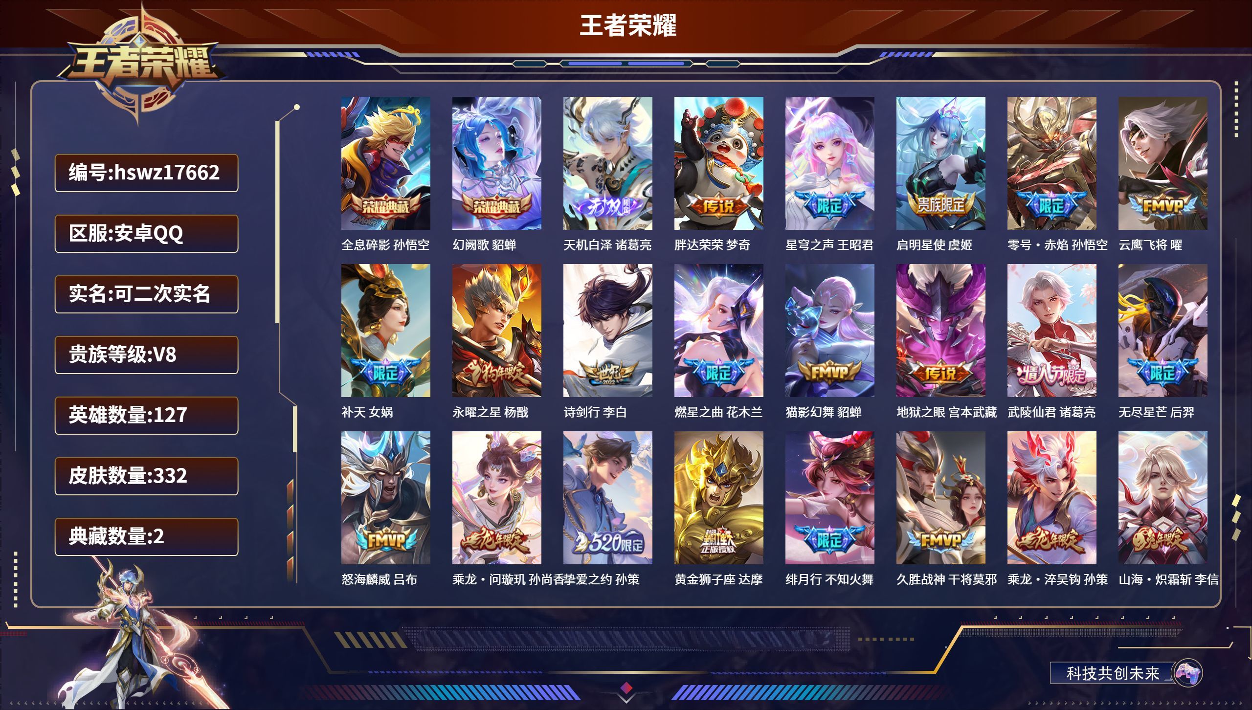 安卓QQ/非凡王者/332皮肤/127英雄/2典藏/0珍品无双/1无双/0珍品传说/32传说/102