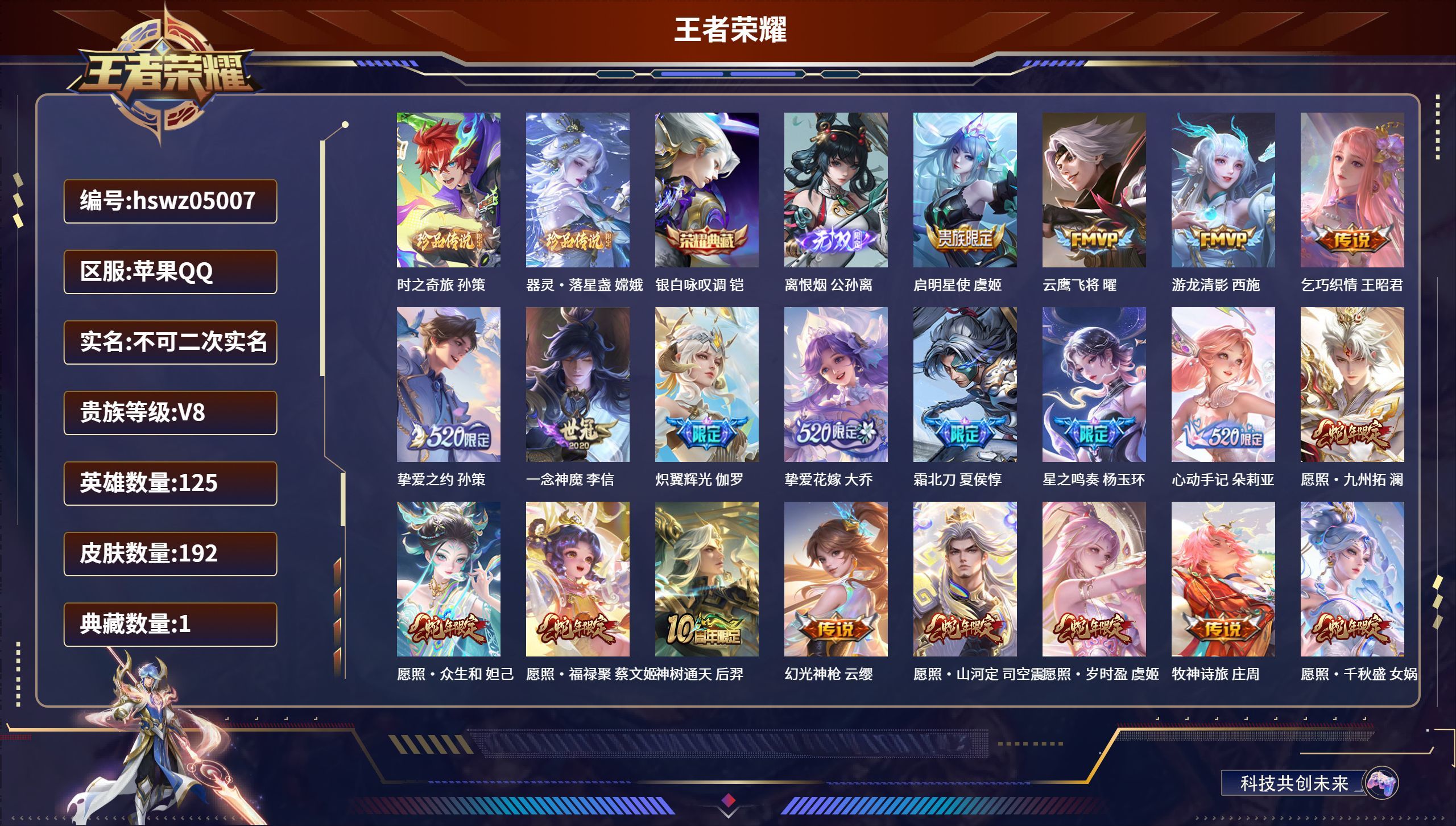 苹果QQ/至尊星耀/192皮肤/125英雄/1典藏/0珍品无双/1无双/2珍品传说/20传说/50史