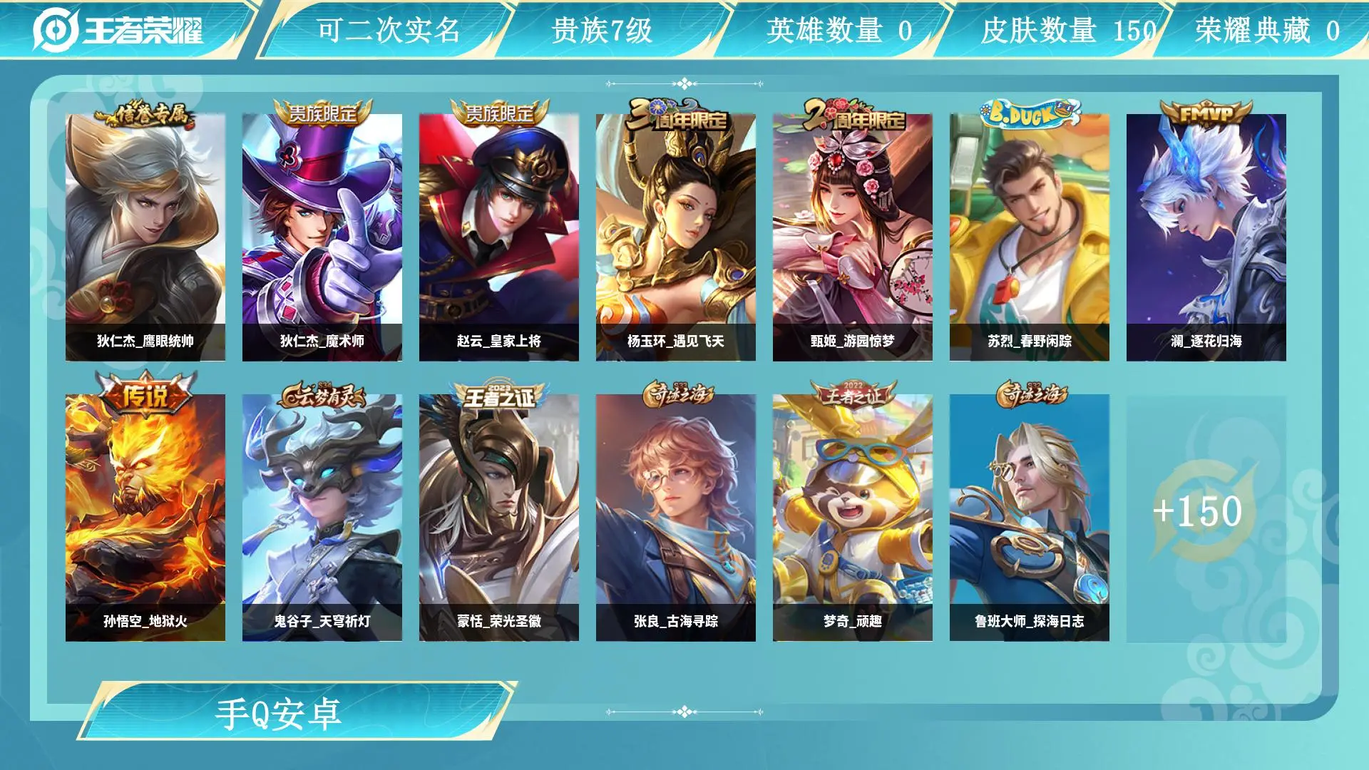安卓QQ/至圣王者/226皮肤/126英雄/1典藏/0珍品无双/0无双/2珍品传说/6传说/65史诗