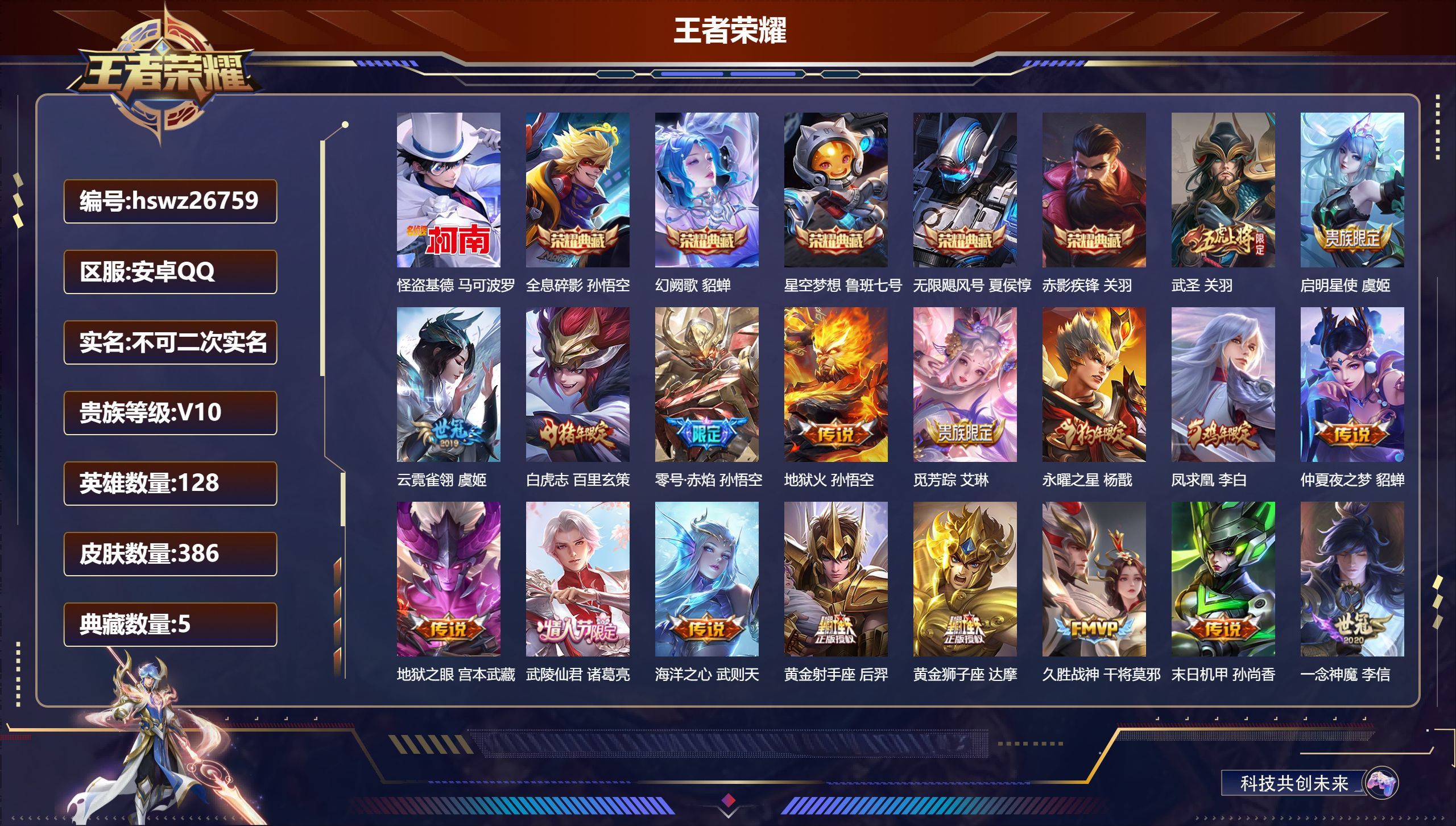 安卓QQ/至尊星耀/386皮肤/128英雄/5典藏/0珍品无双/0无双/1珍品传说/24传说/115