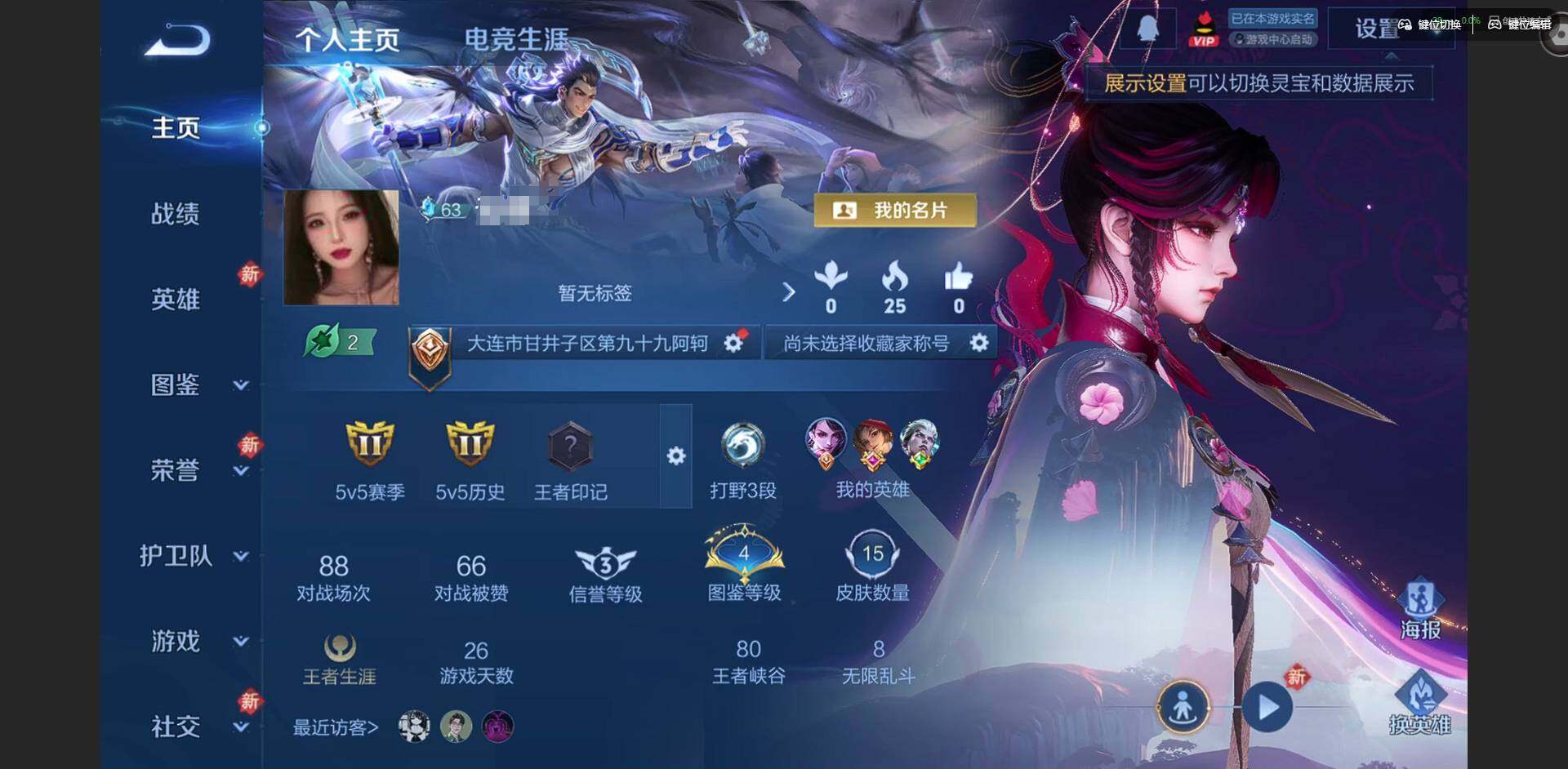实名: 可修改 贵族等级: V8 英雄数: 126 皮肤数: 317 荣耀水晶