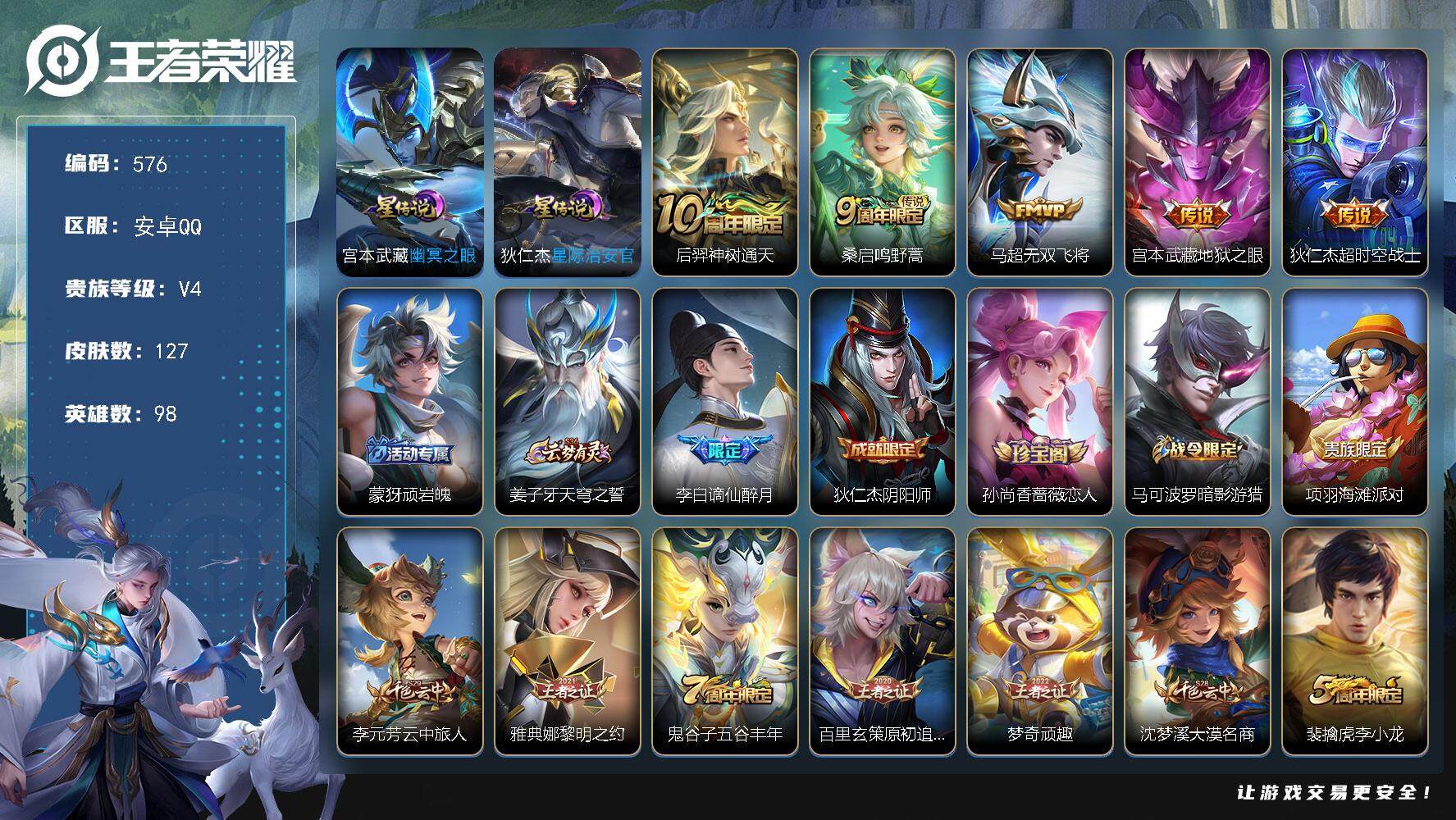 安卓QQ/无双王者/268皮肤/126英雄/2典藏/0珍品无双/0无双/1珍品传说/9传说/81史诗