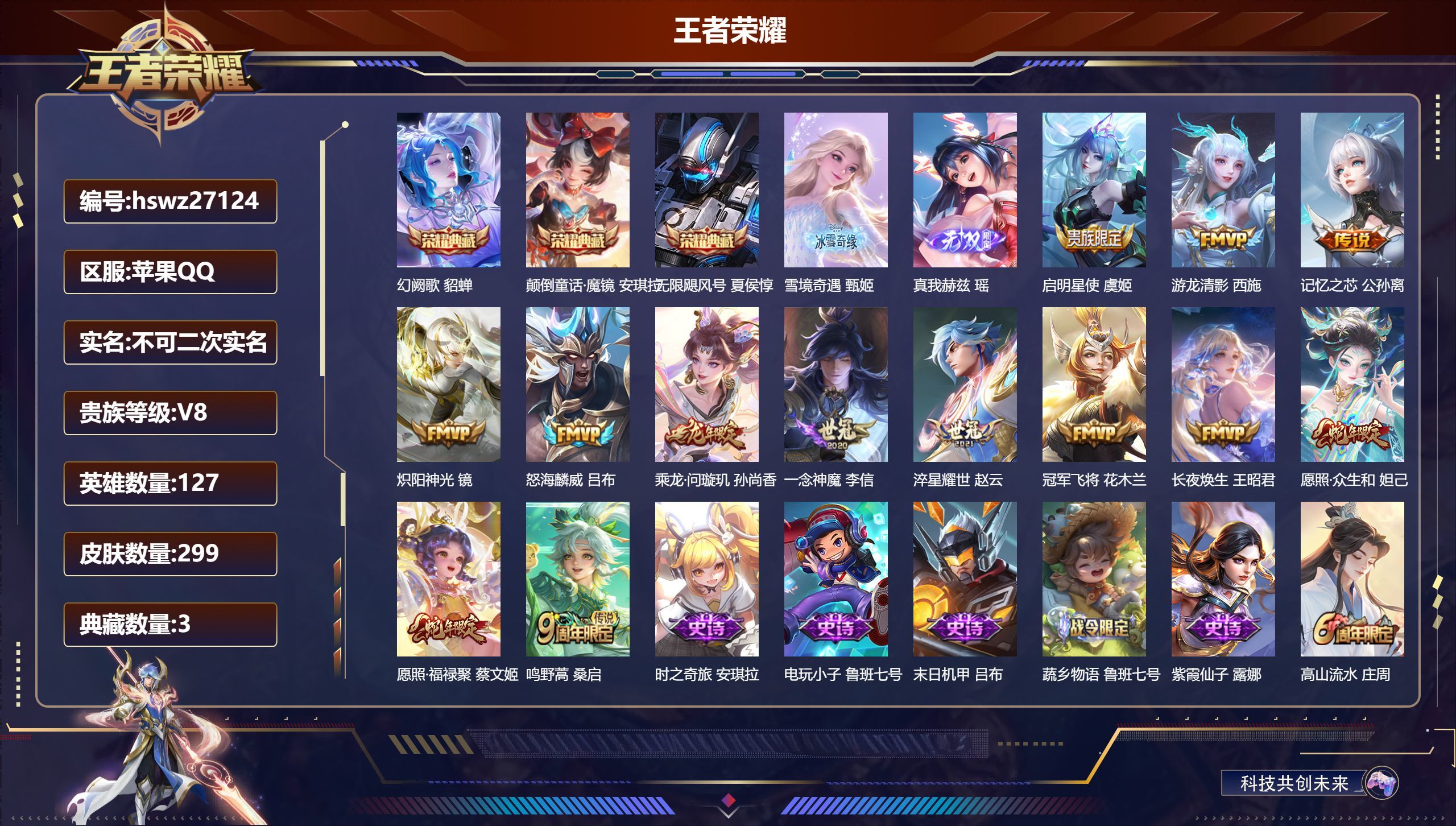 苹果QQ/绝世王者/299皮肤/127英雄/3典藏/0珍品无双/2无双/0珍品传说/13传说/90史