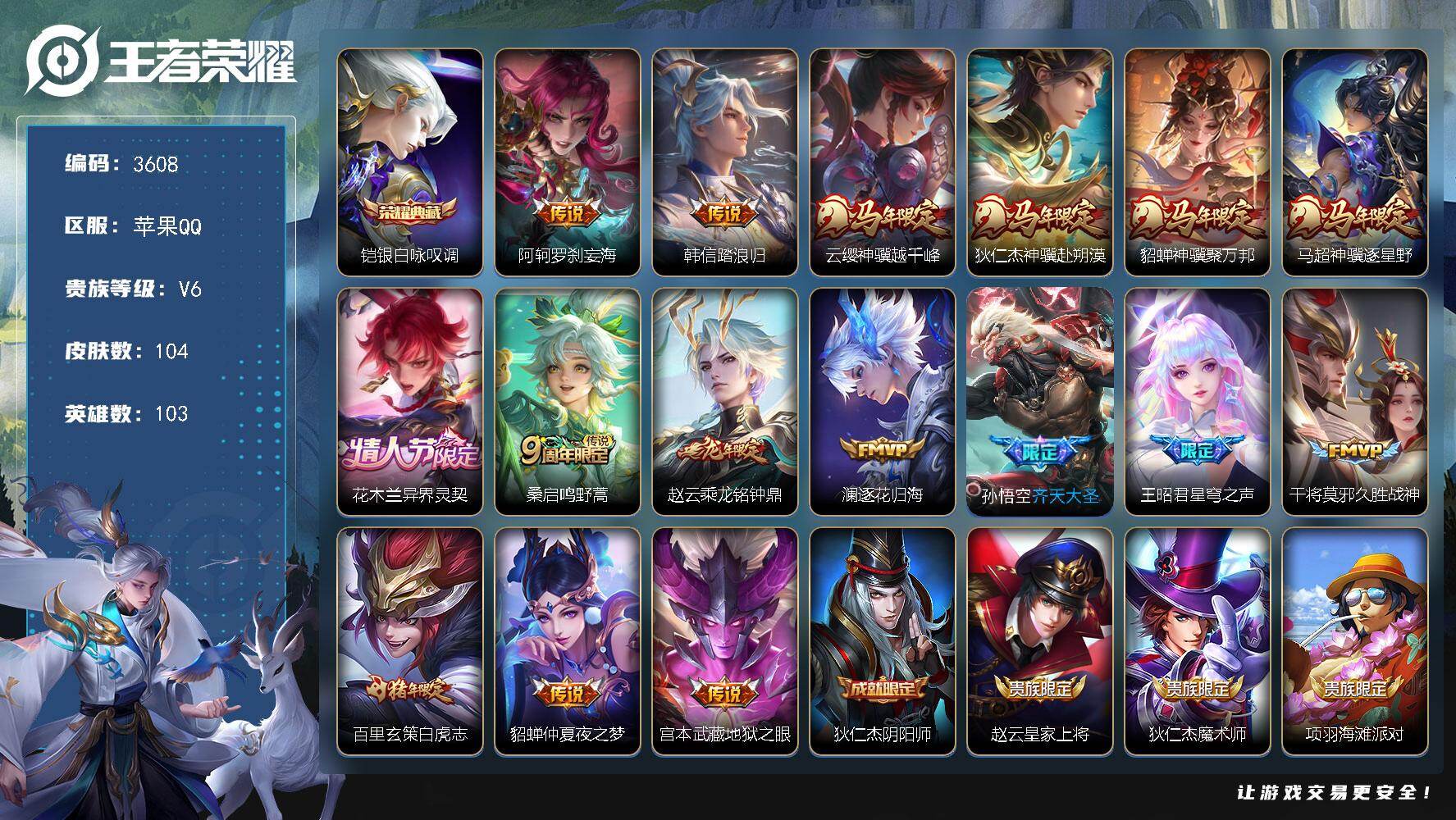 苹果Q-V6-至尊星耀IV段位-96英雄-95皮肤-6传说-28史诗【传说皮