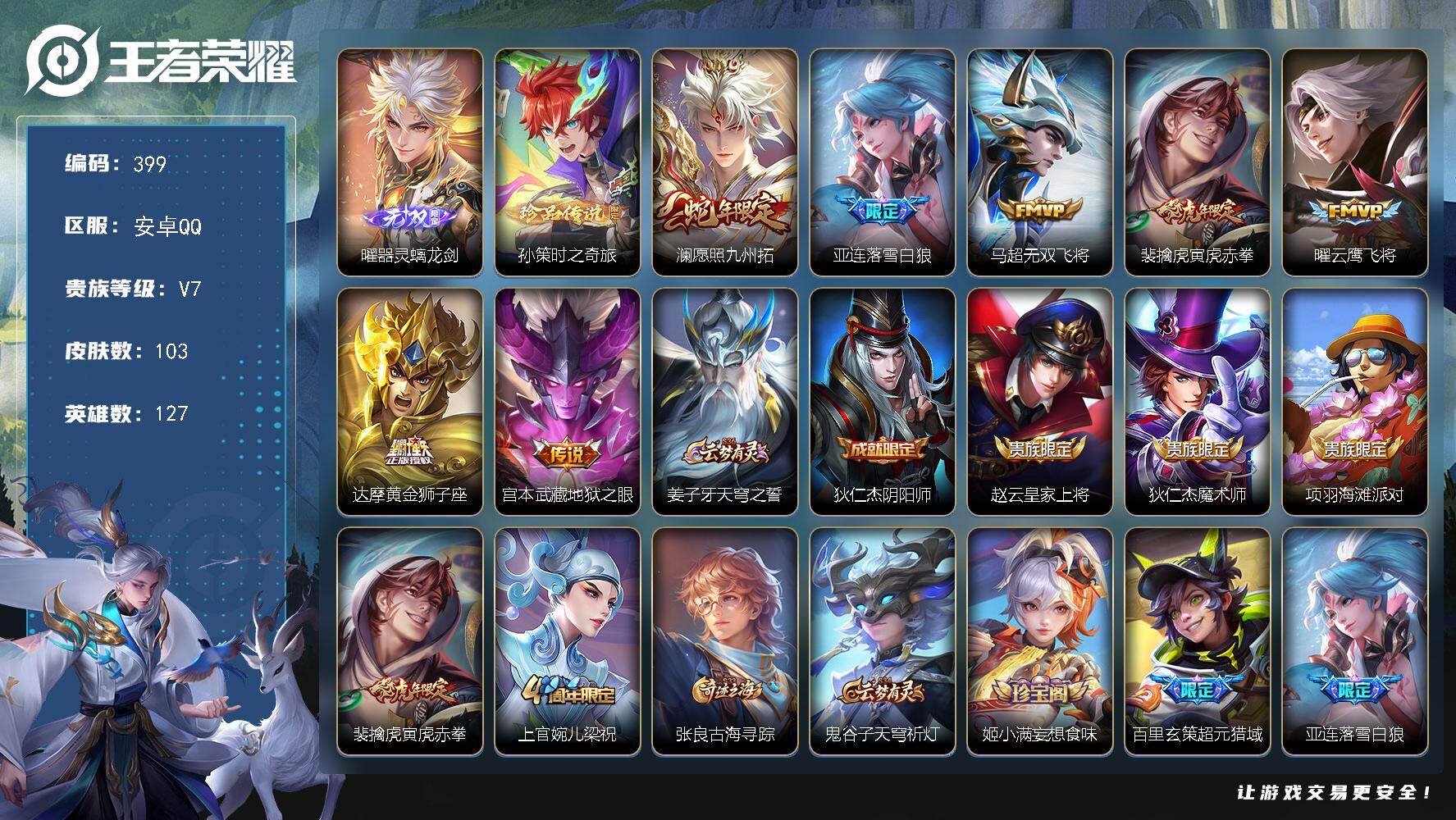 安卓QQ/传奇王者/256皮肤/127英雄/2典藏/0珍品无双/0无双/1珍品传说/10传说/72史