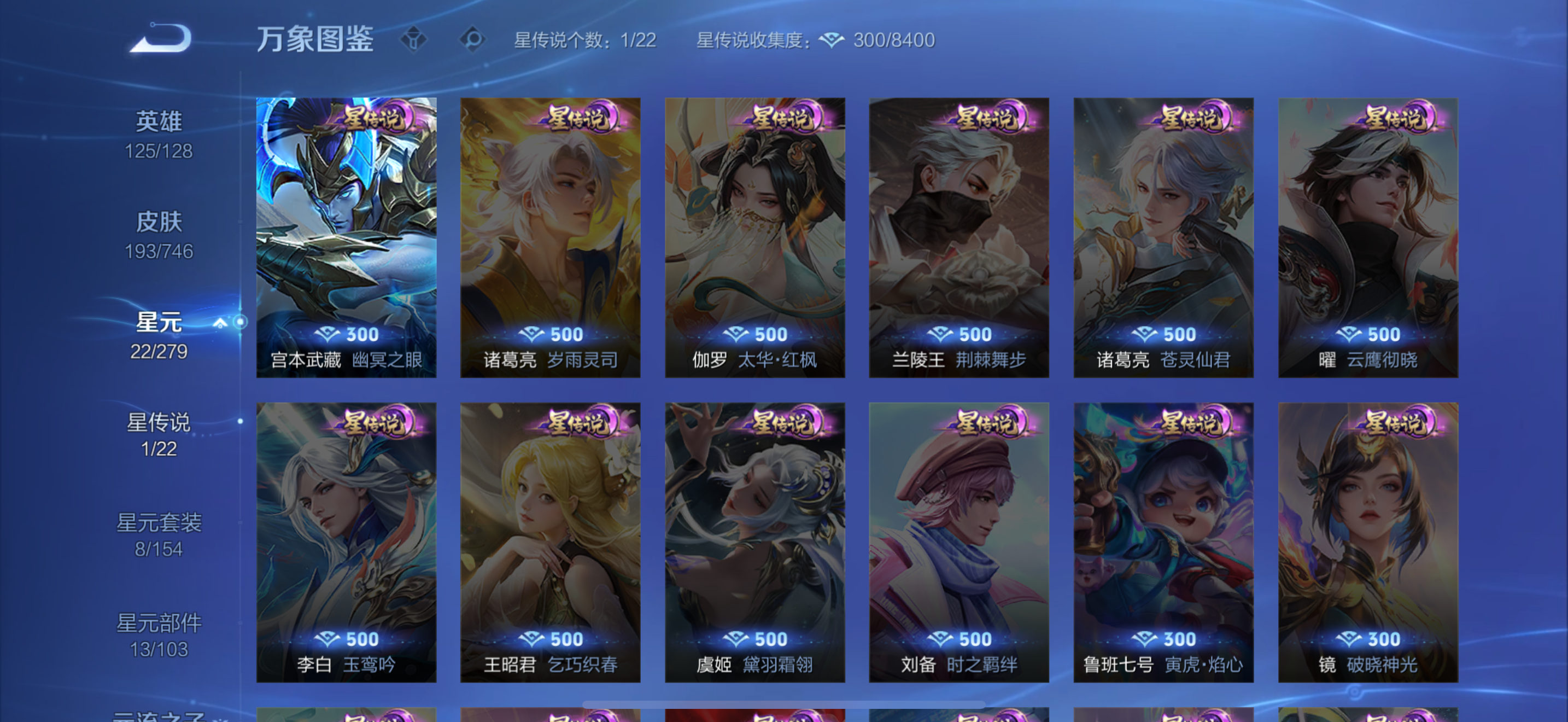 安卓v/无双王者/293皮肤/126英雄/1典藏/0珍品无双/0无双/2珍品传说/8传说/68史诗