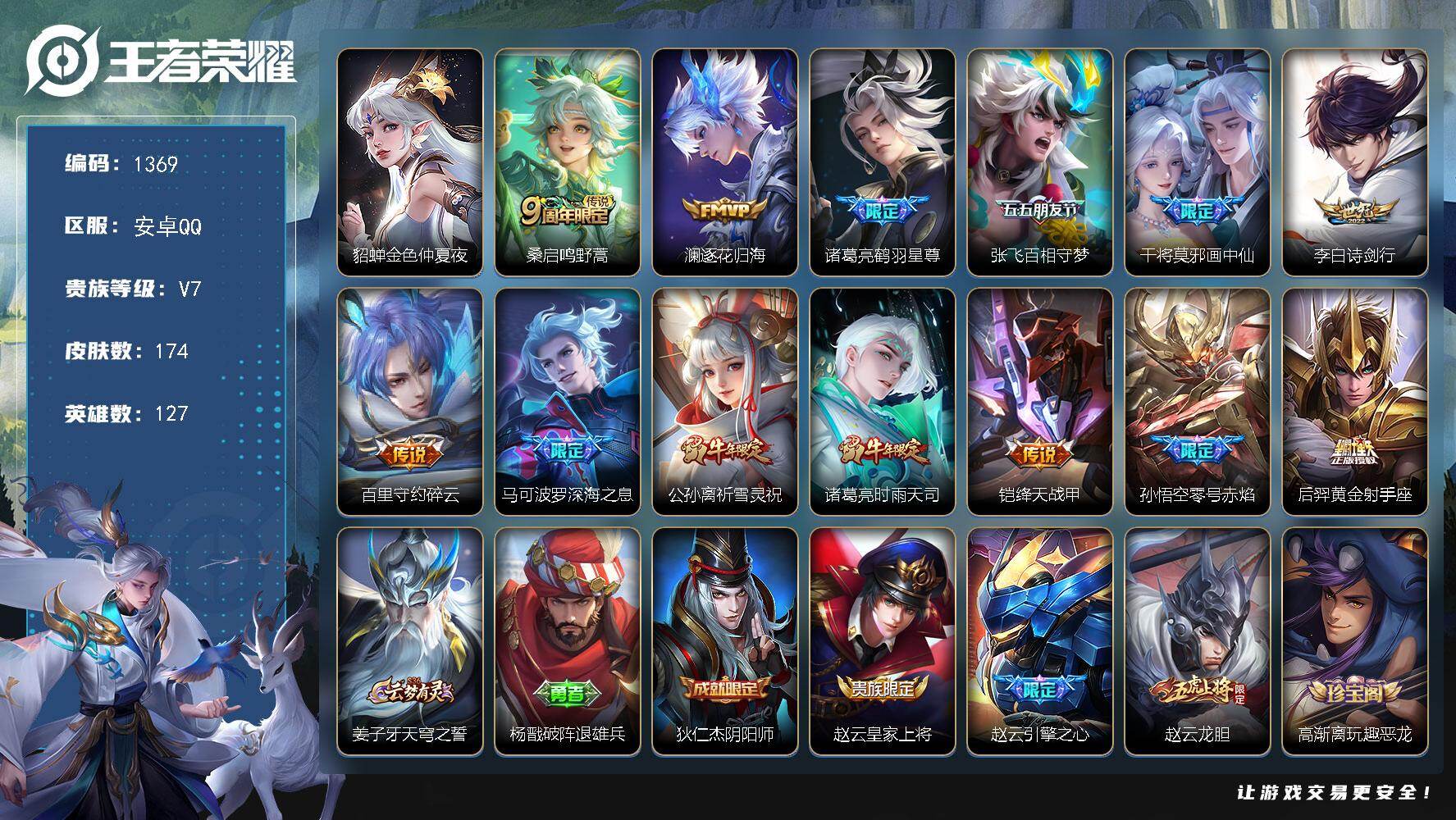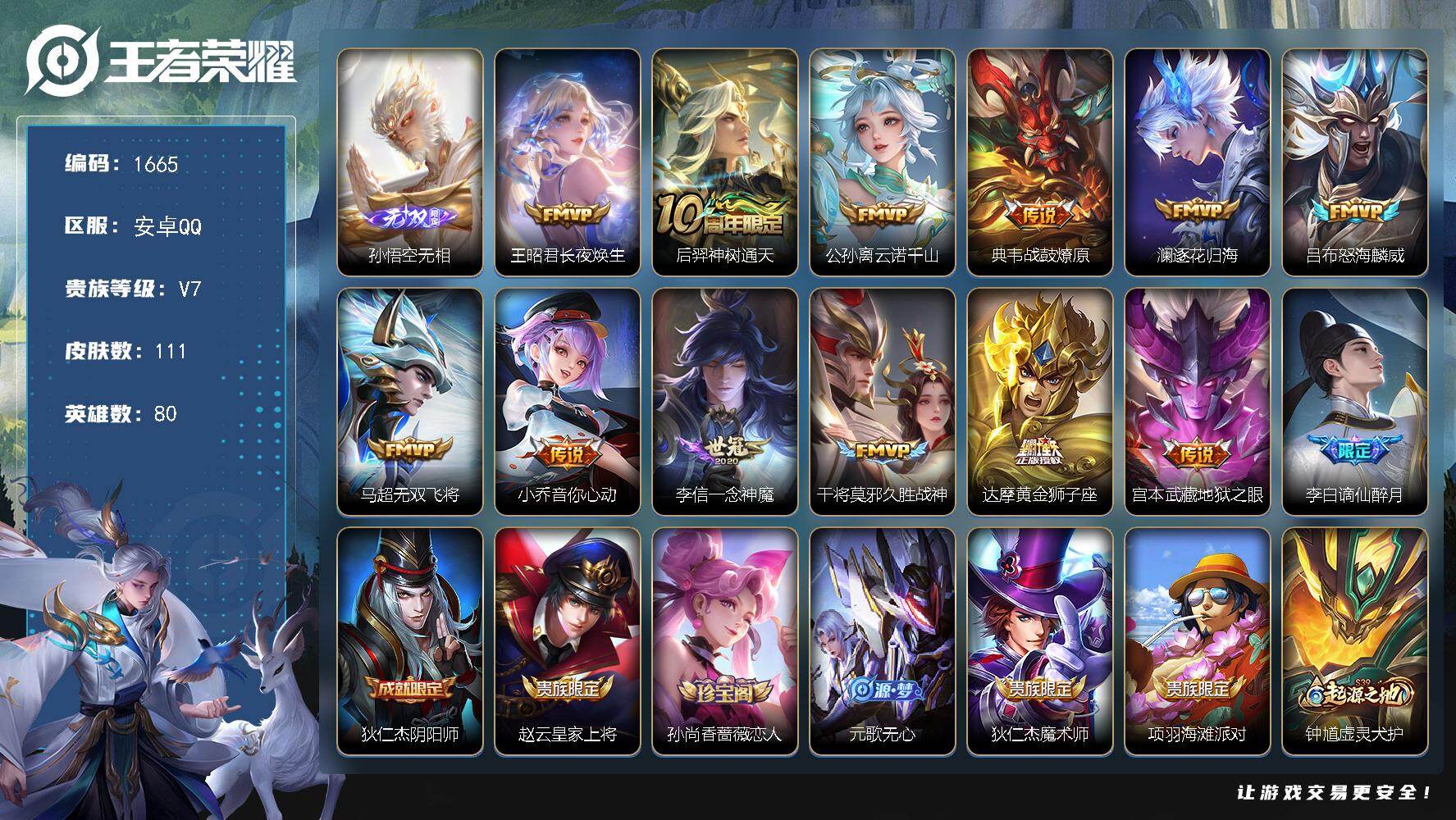2693702 王者荣耀账号 安卓Q-V7-最强王者段位-80英雄-111皮肤