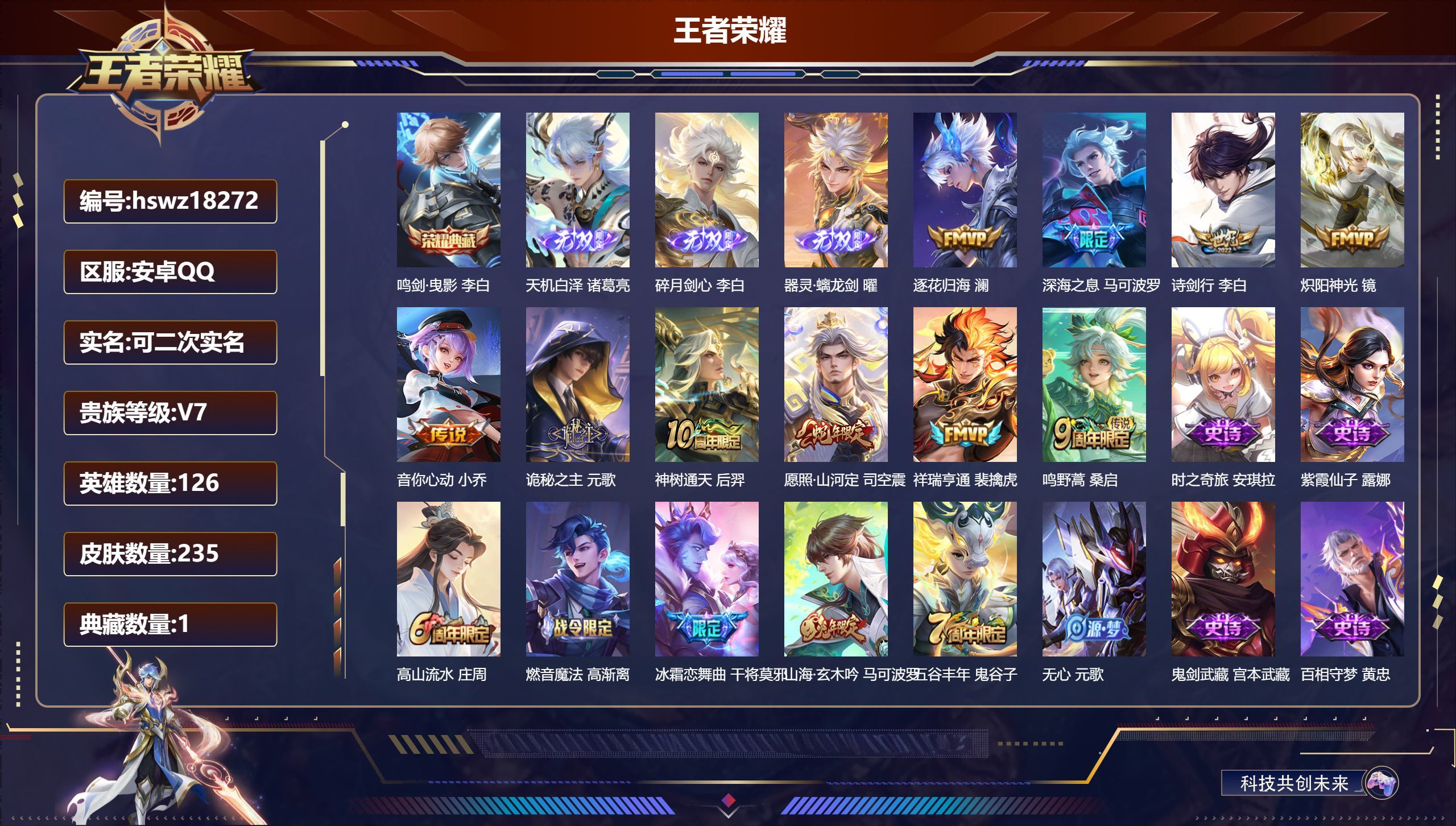 安卓QQ/无双王者/235皮肤/126英雄/1典藏/0珍品无双/3无双/0珍品传说/10传说/63史
