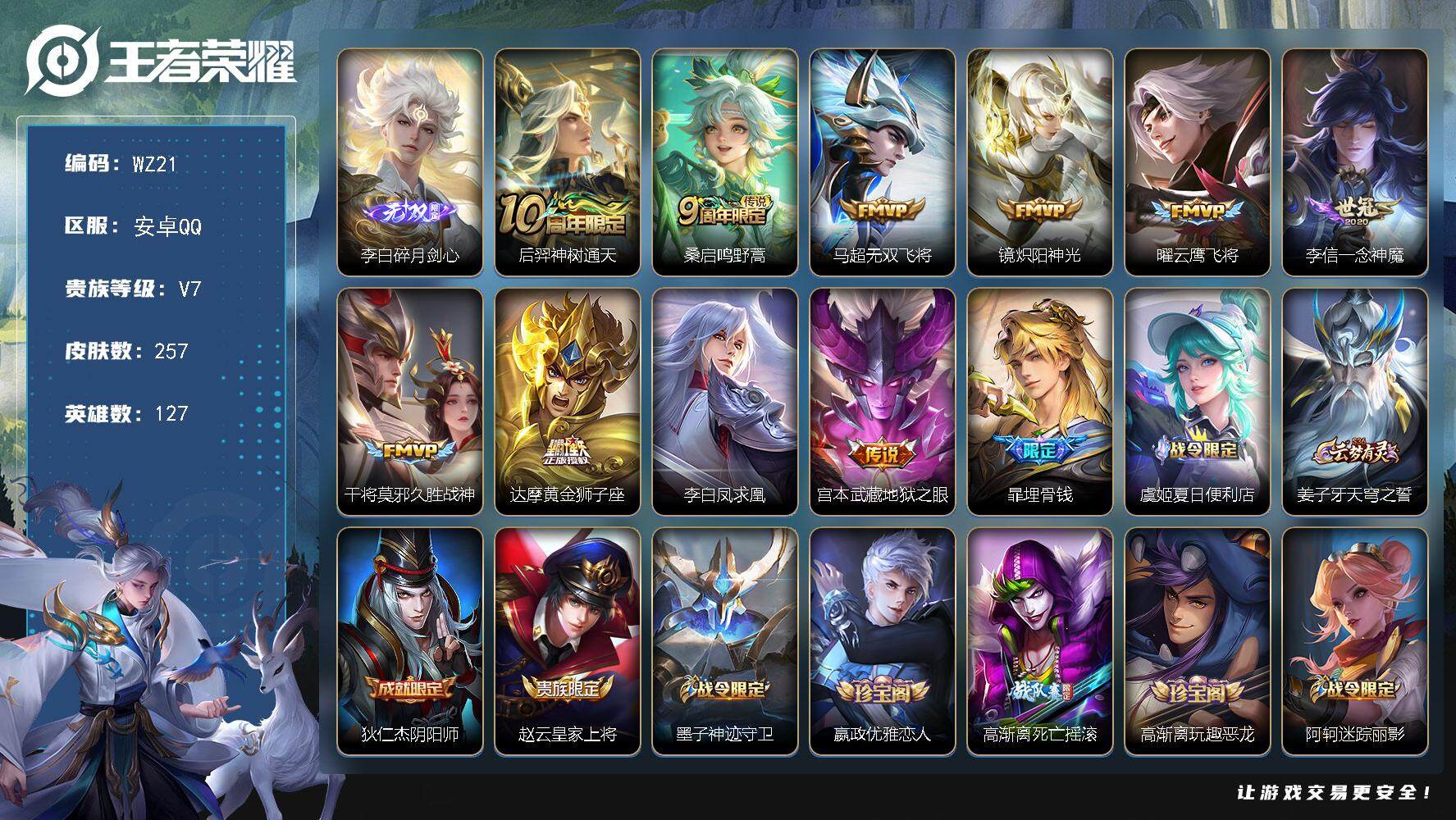 安卓Q-V7-最强王者段位-127英雄-257皮肤-0典藏-0珍品无双-1无双
