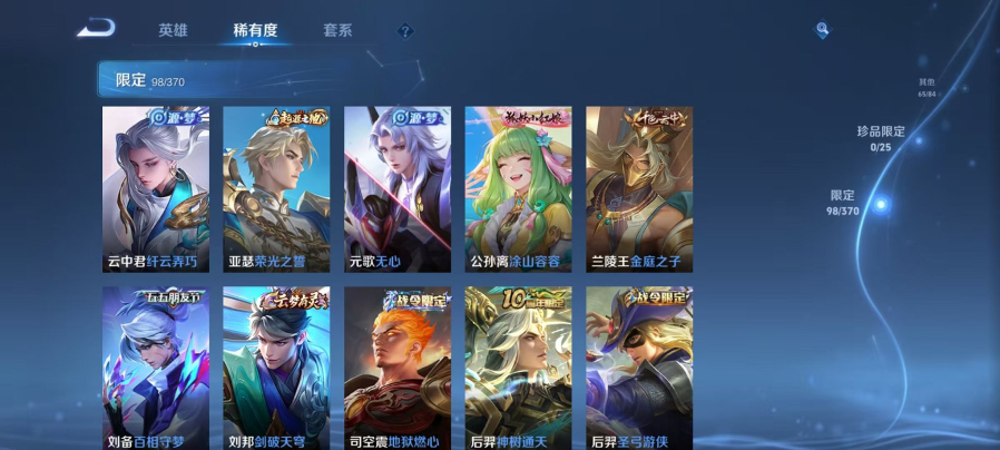 V10 皮肤561 英雄130 至尊星耀 荣耀典藏15 无双皮肤4 珍品传说1 星传说5 传说67