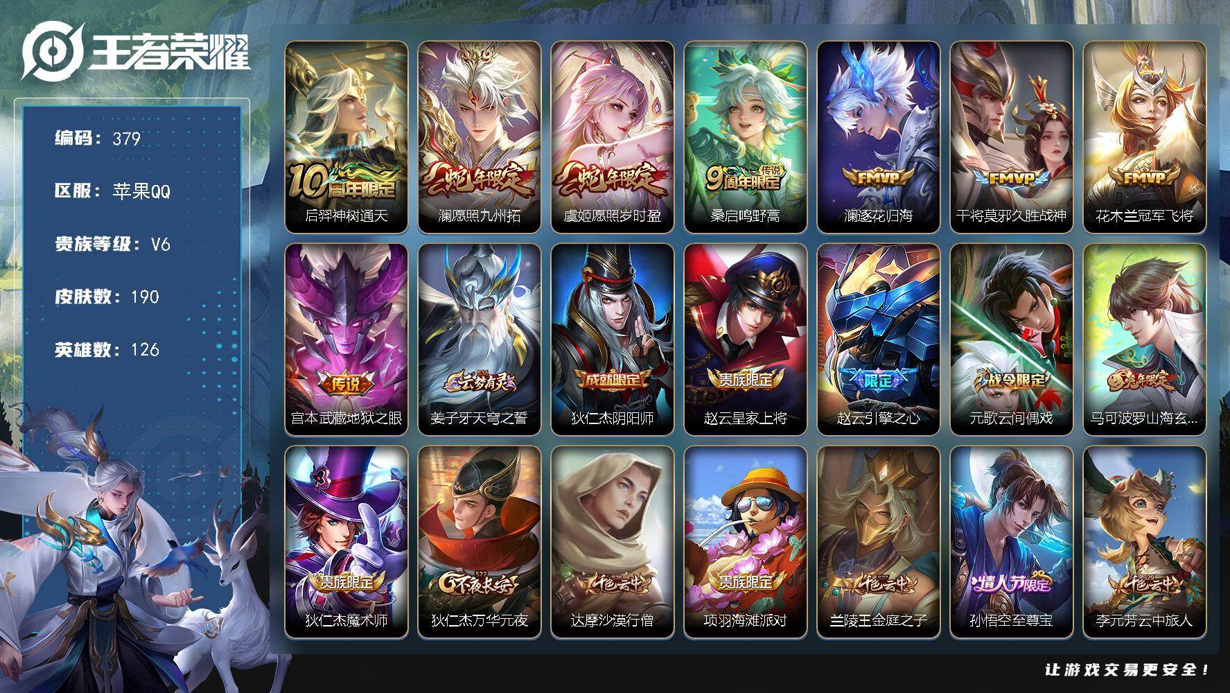 实名: 可修改 贵族等级: V6 英雄数: 119 皮肤数: 129 珍品传说