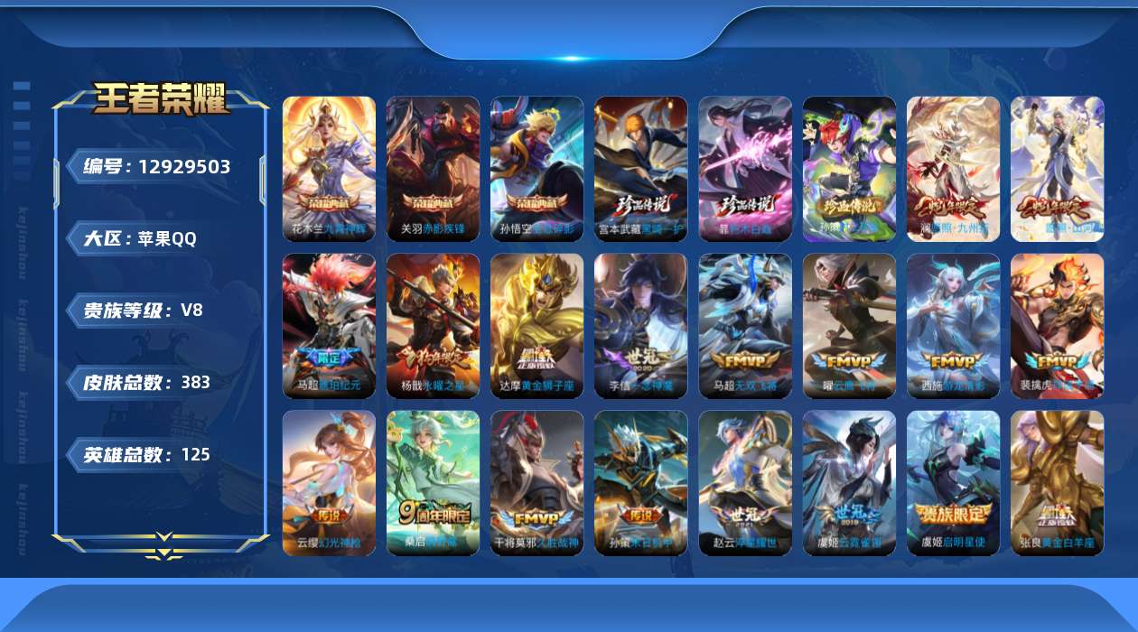 苹果Q-V8-最强王者段位-126英雄-376皮肤-3典藏-0珍品无双-1无双-2珍品传说-26传说