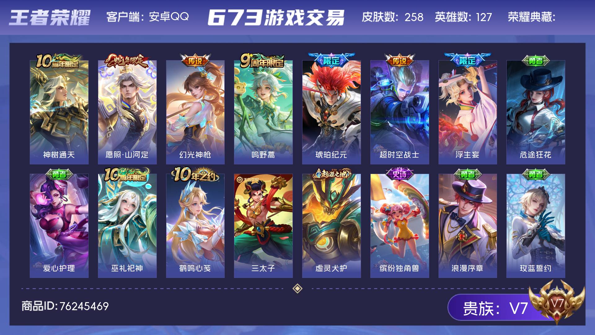 V7 皮肤258 英雄127 尊贵铂金 传说7