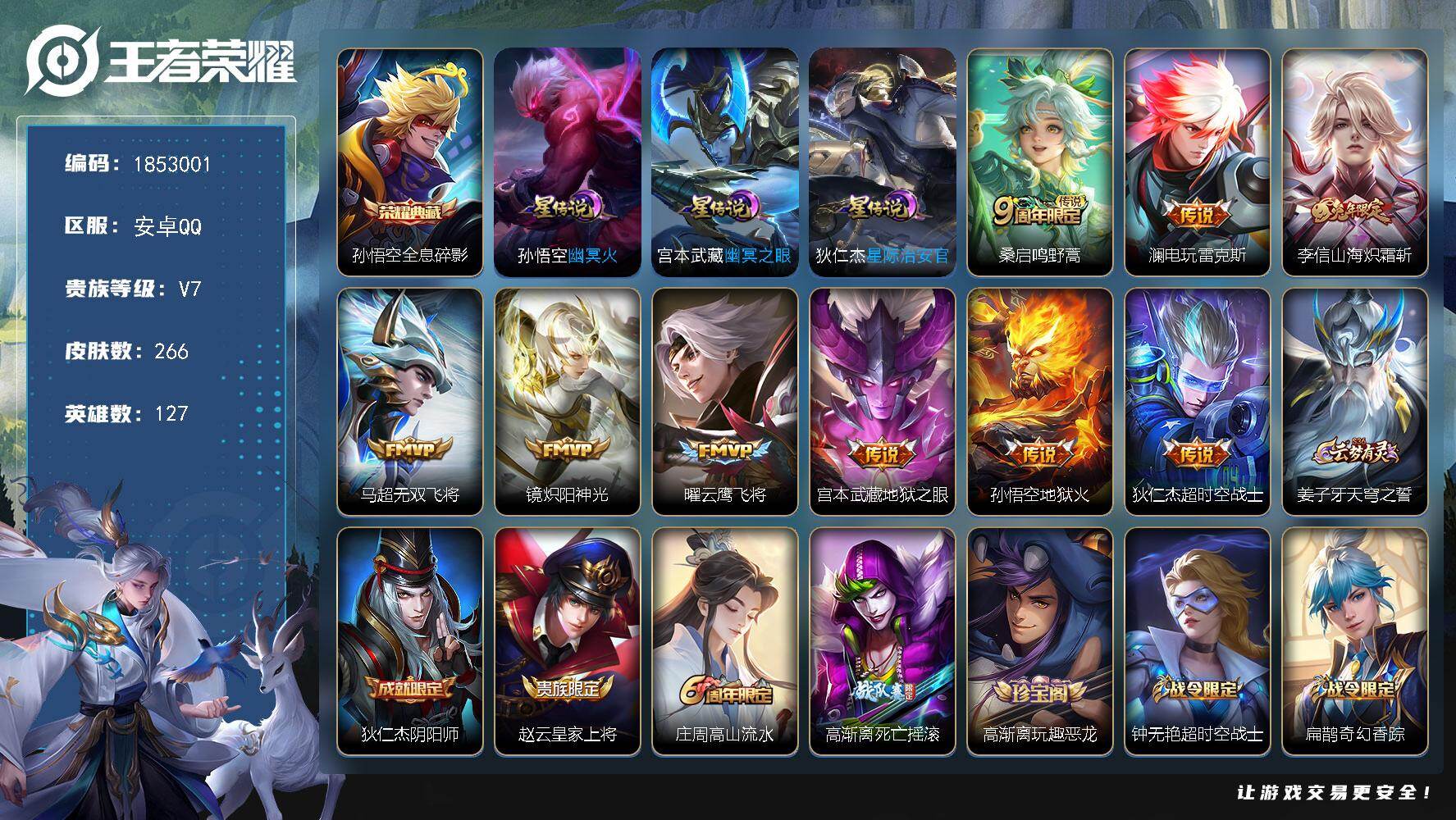 V7-至尊星耀IV段位-127英雄-266皮肤-1典藏皮肤-9传说-72史诗