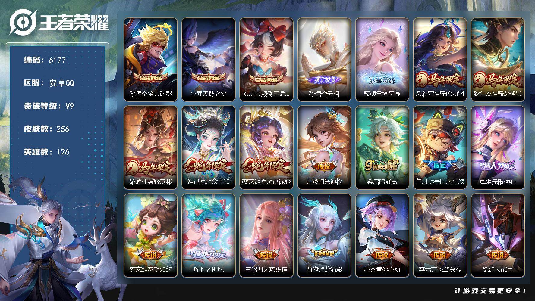 贵族9/皮肤256/典藏3/传说25/史诗59/英雄126/敖隐全皮/全息碎影