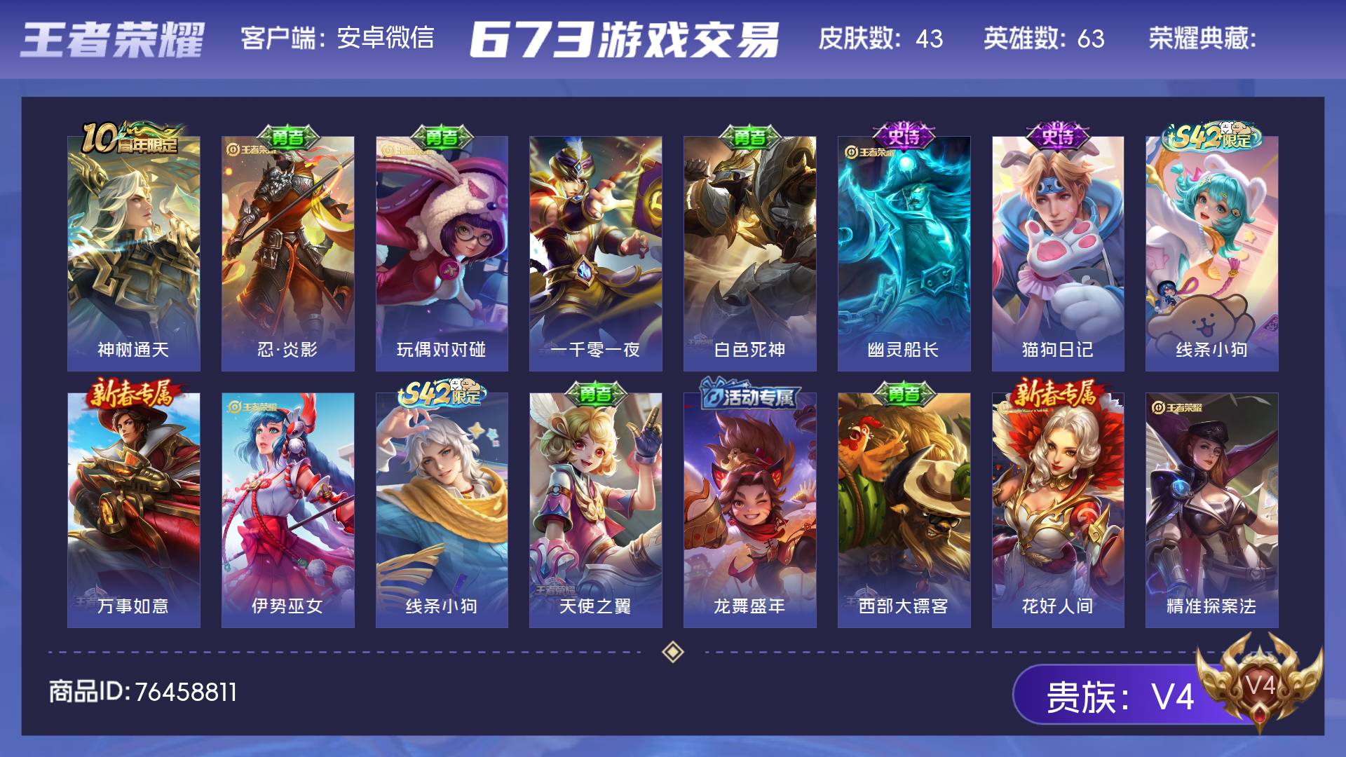 V4 皮肤43 英雄63 至尊星耀 传说1