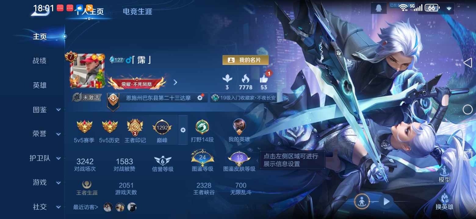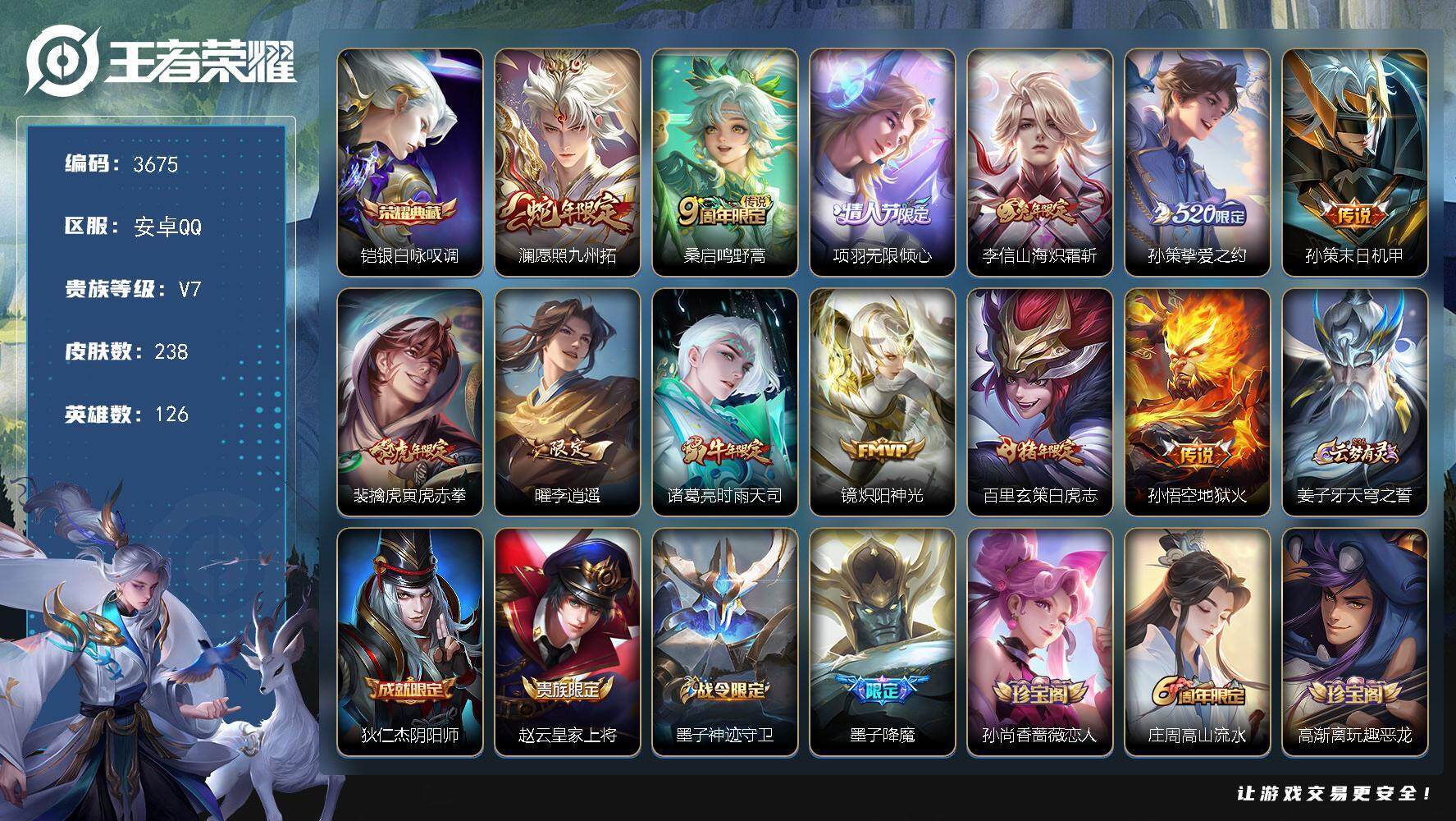 安卓QQ/绝世王者/314皮肤/126英雄/2典藏/0珍品无双/1无双/2珍品传说/23传说/101