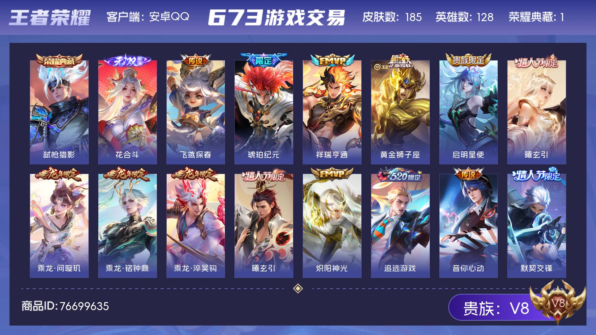 V8 皮肤185 英雄128 至尊星耀 荣耀典藏1 无双皮肤1 传说16