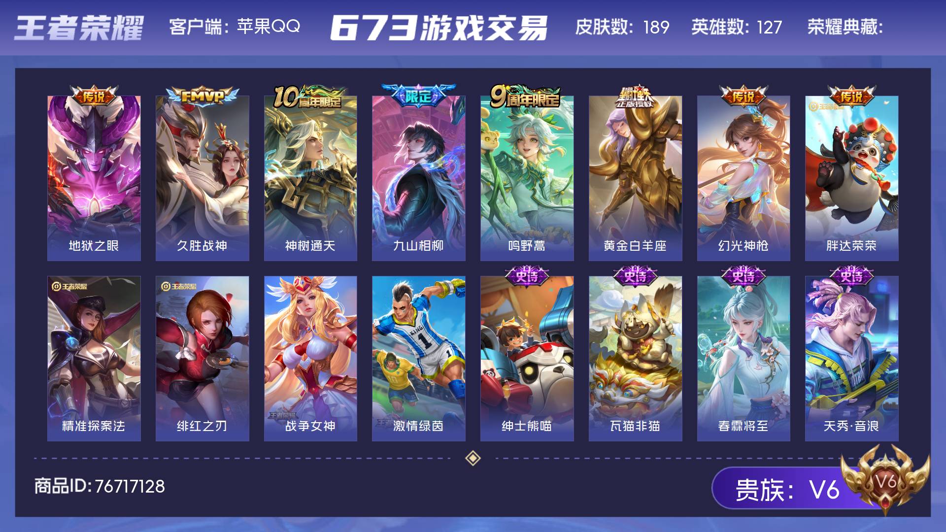 苹果Q-V3-尊贵铂金IV段位-77英雄-50皮肤-1传说-5史诗【英雄全皮】