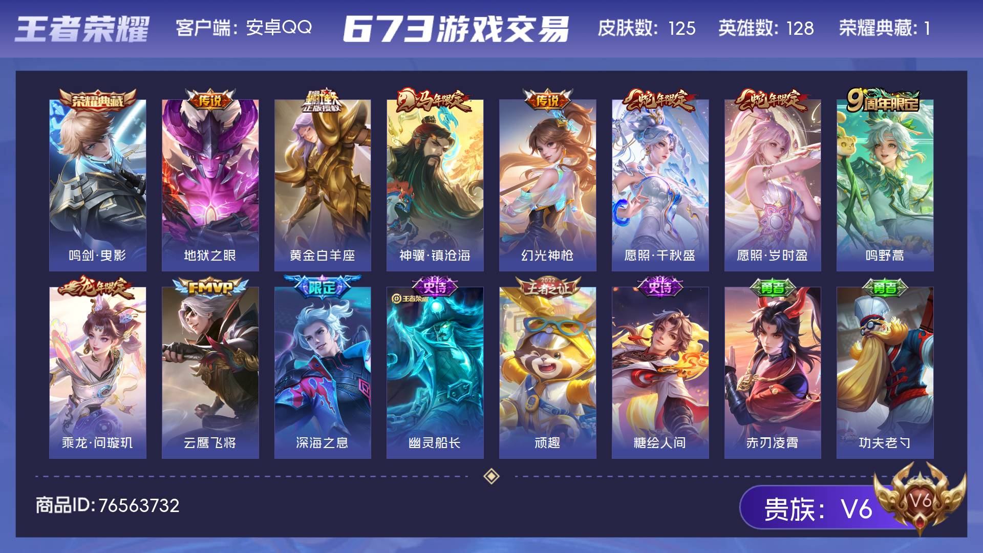 V6 皮肤125 英雄128 永恒钻石 荣耀典藏1 传说10