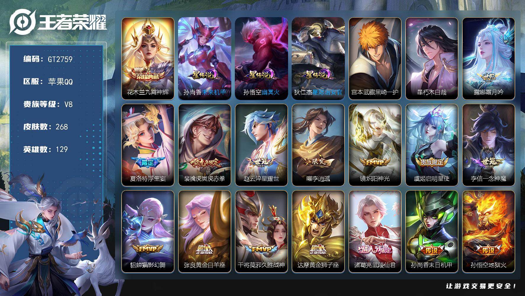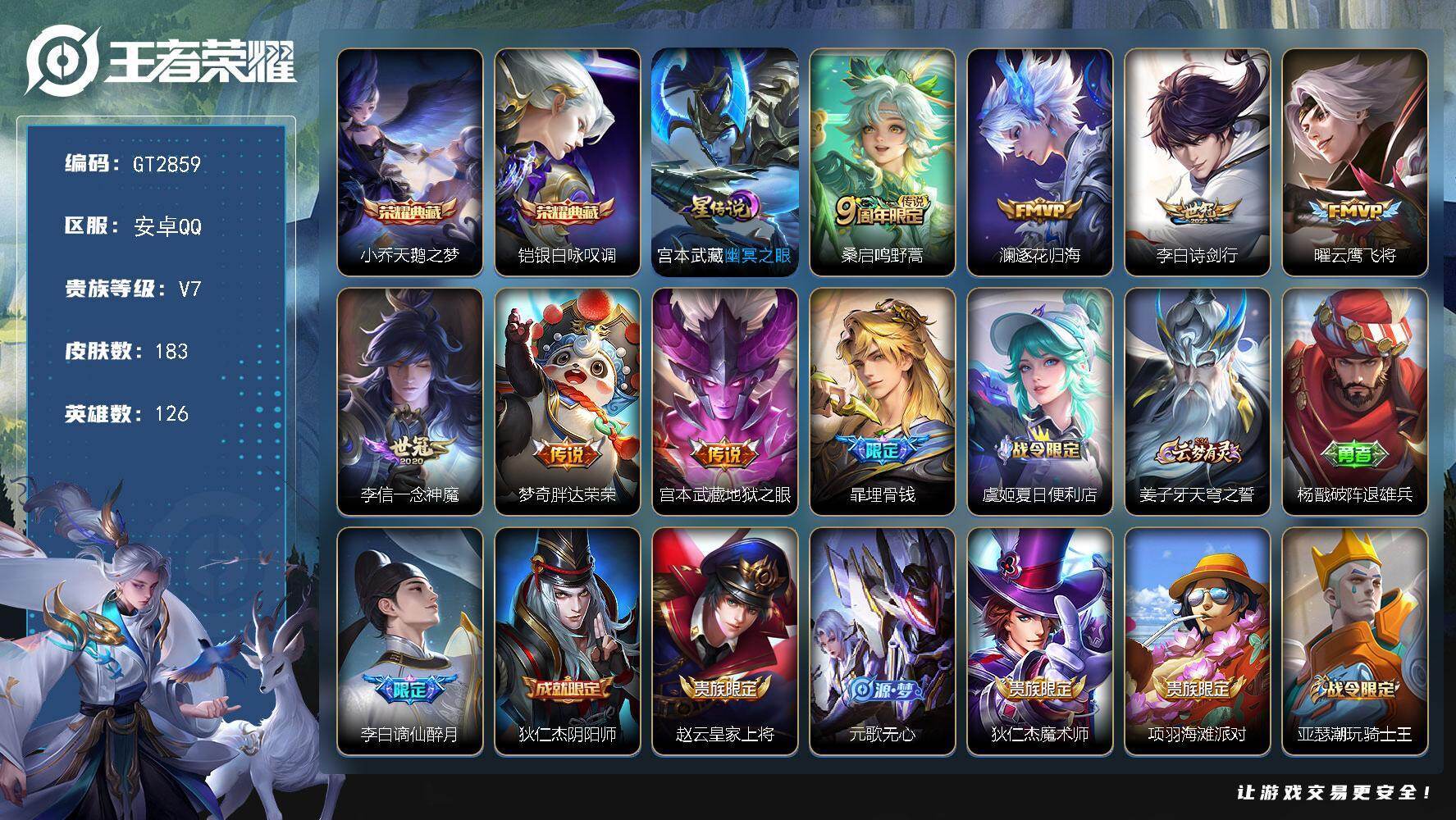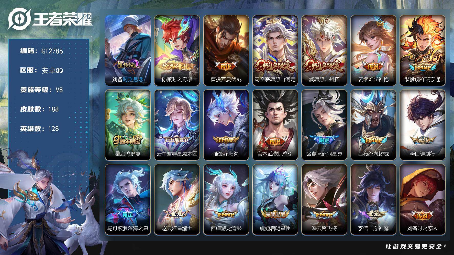 安卓Q-V7-最强王者段位-128英雄-265皮肤-1典藏皮肤-1无双-1珍品