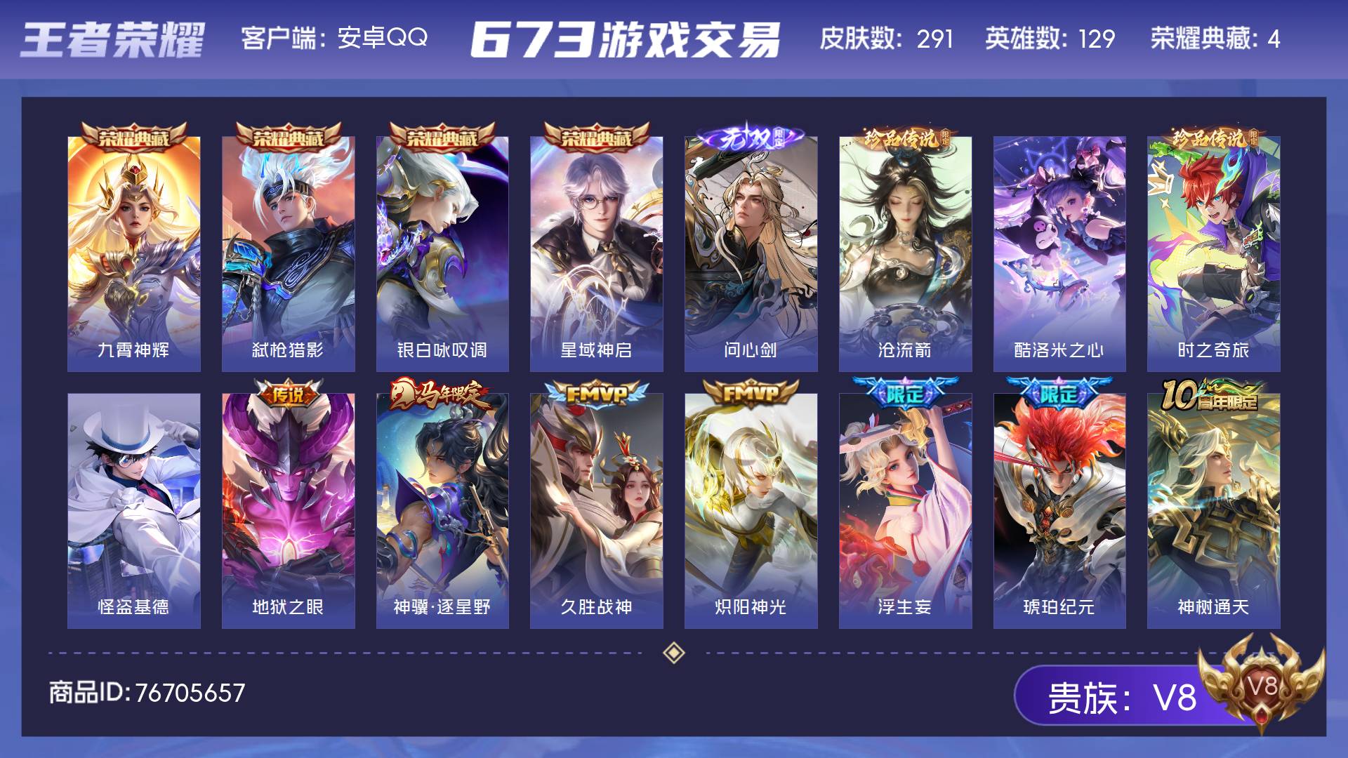 V8 皮肤291 英雄129 永恒钻石 荣耀典藏4 无双皮肤1 珍品传说4 传说21