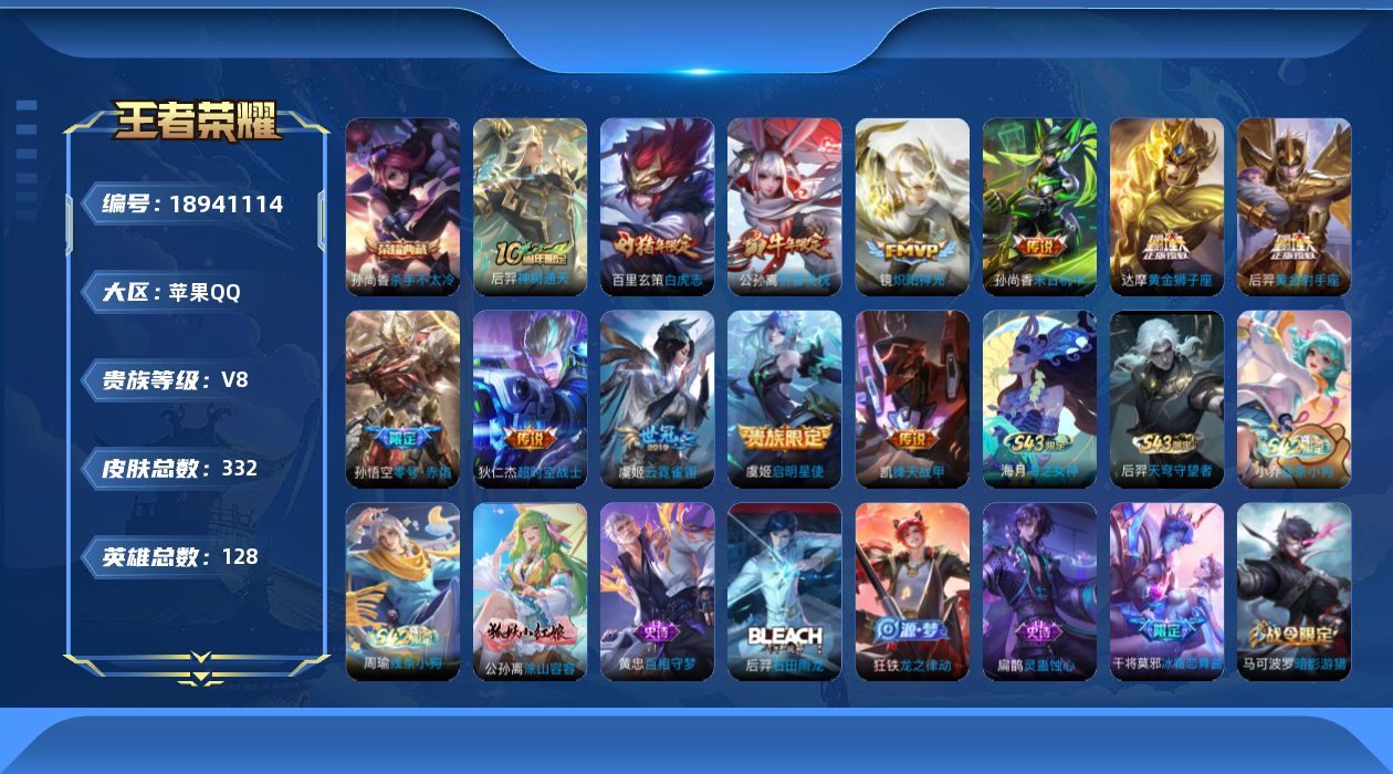 苹果Q-V8-最强王者段位-128英雄-332皮肤-1典藏皮