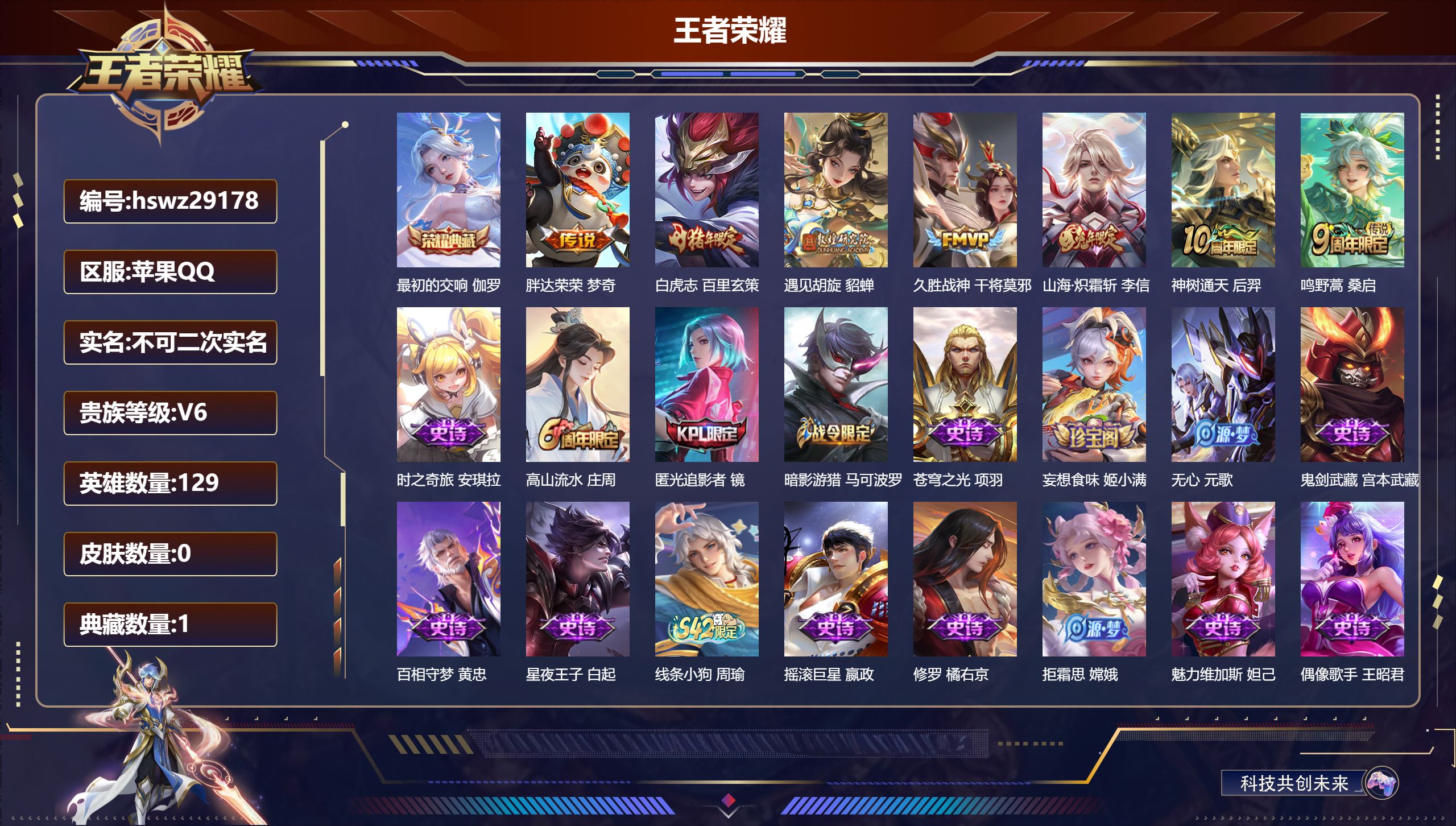 苹果QQ/永恒钻石/216皮肤/129英雄/1典藏/0珍品无双/0无双/0珍品传