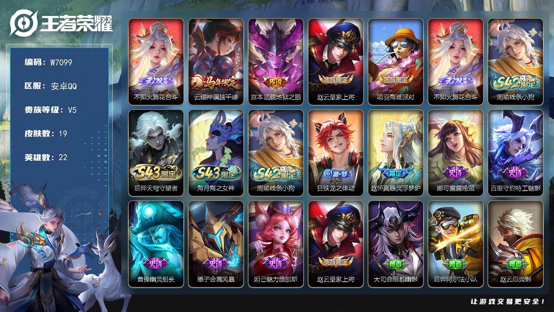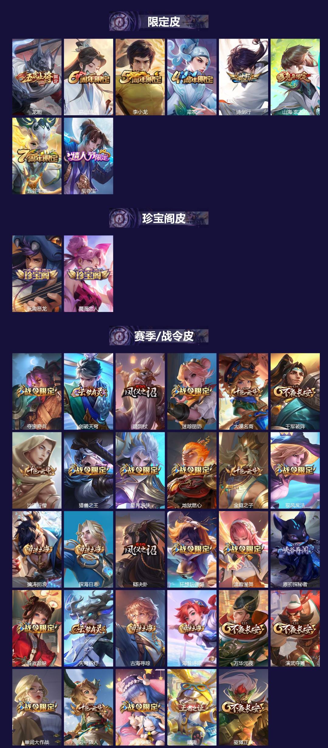 贵族等级5/荣耀典藏数量1/传说皮肤数量5/史诗皮肤数量50