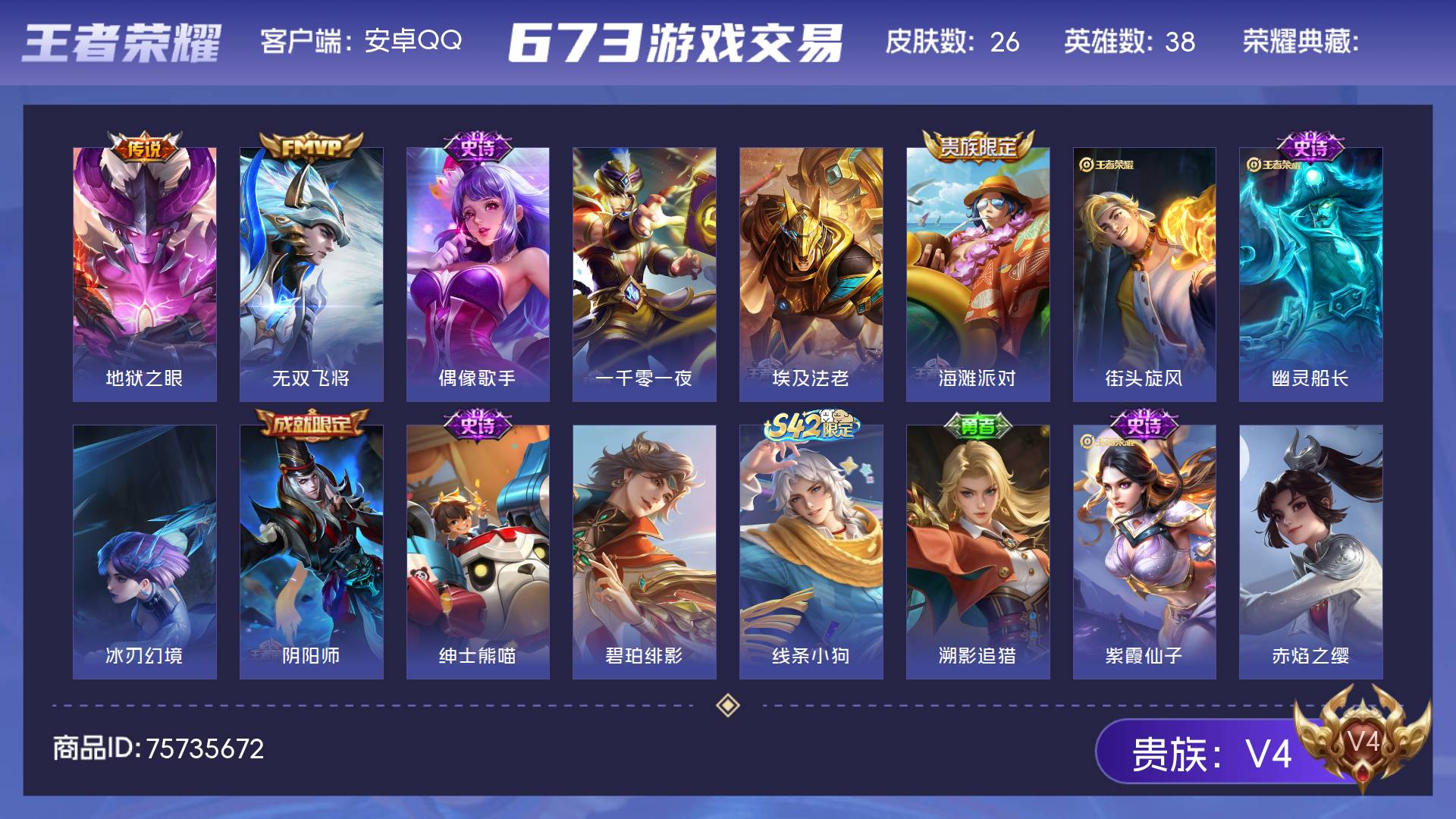 V4 皮肤26 英雄38 最强王者 传说2 其他皮肤25