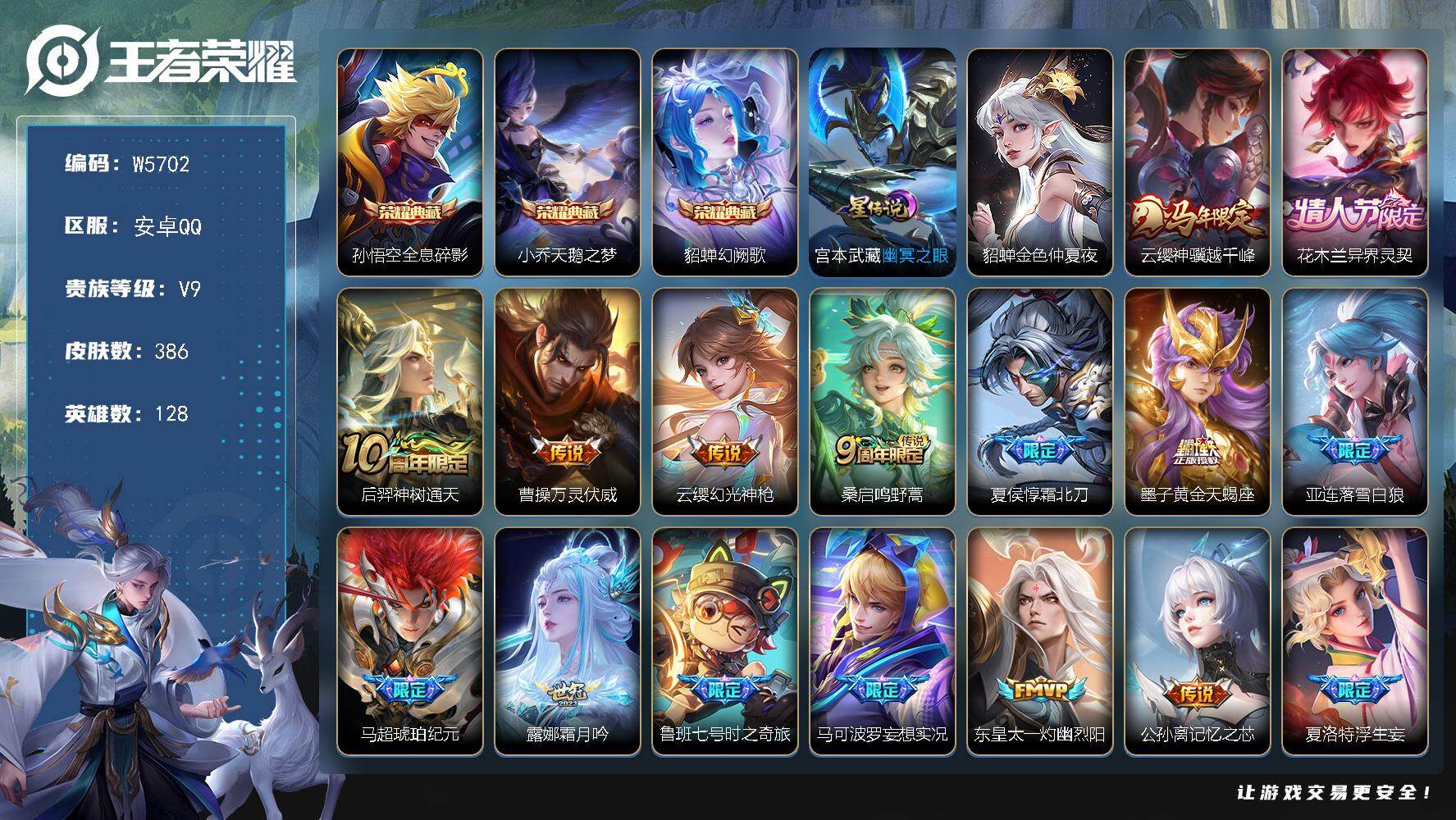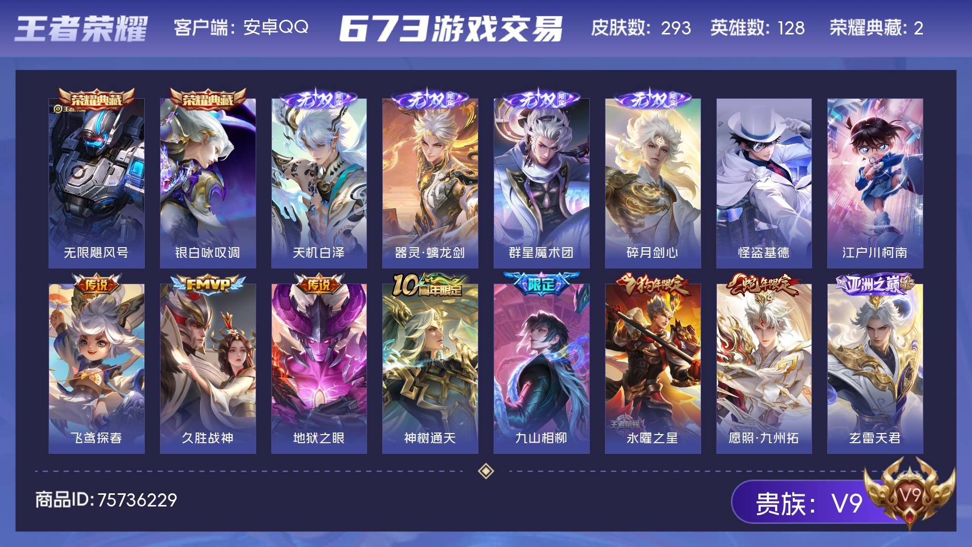 V9 皮肤293 英雄128 最强王者 荣耀典藏2 无双皮肤4 珍品传说2 星传说4 传说40 其他皮肤249