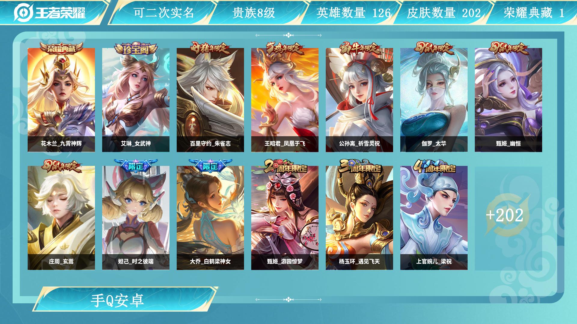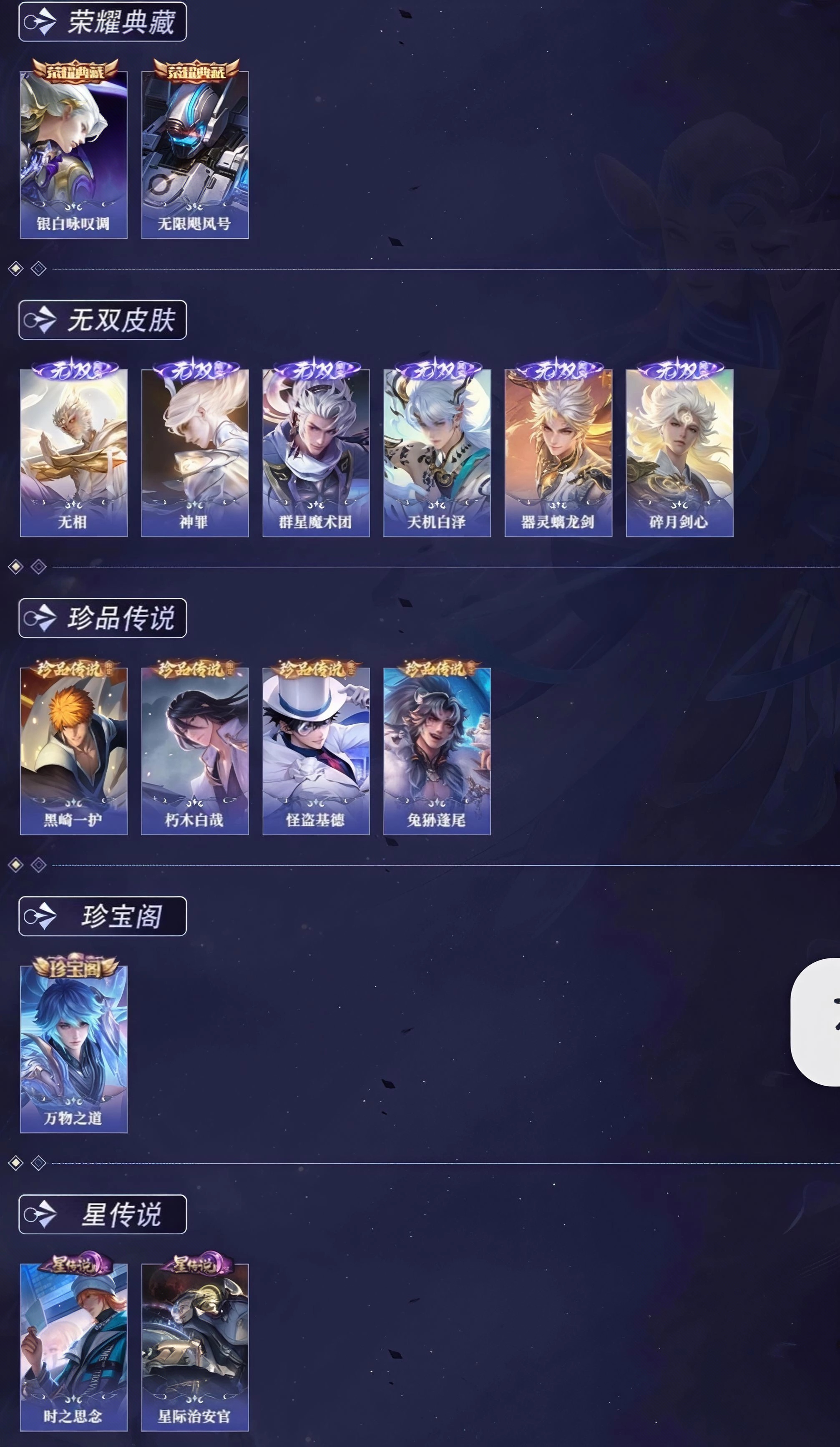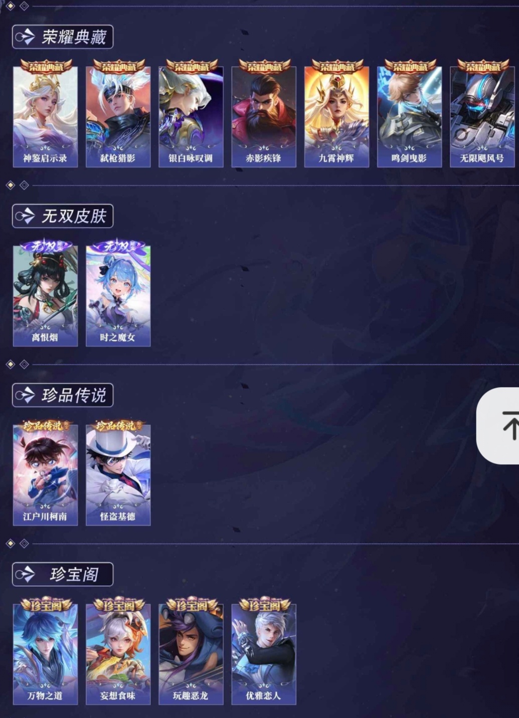 贵族9 荣耀典藏2 无双6 珍品传说4 星元皮肤2 传说皮肤35