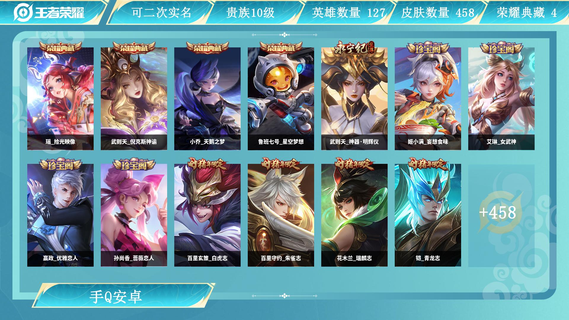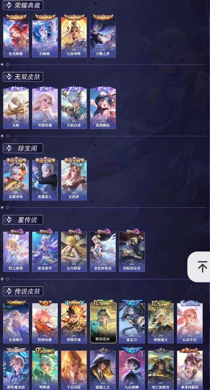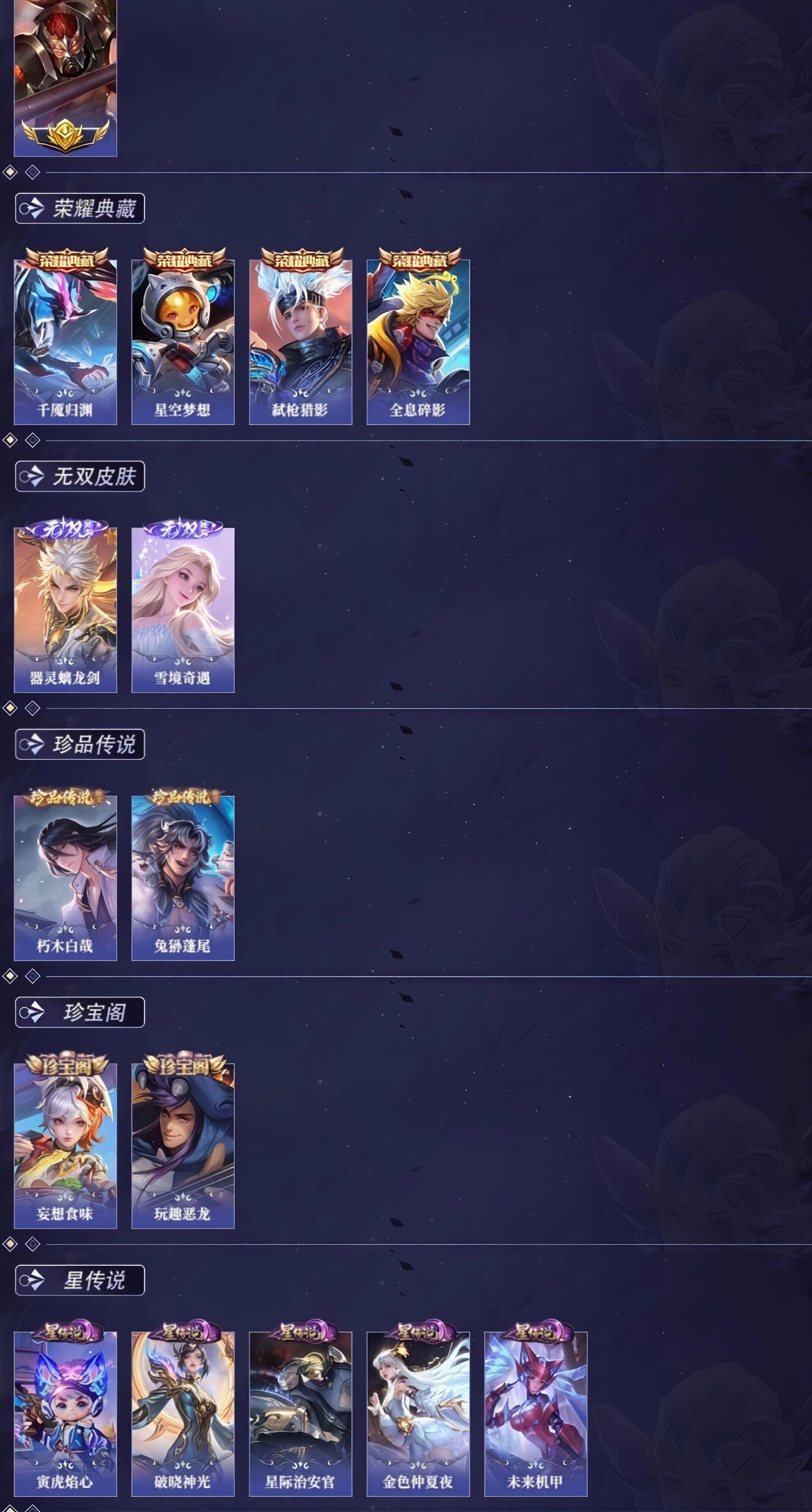 贵族10 荣耀典藏4 无双2 珍品传说2 星元皮肤5 传说皮肤49 星元套装40皮肤数量五百