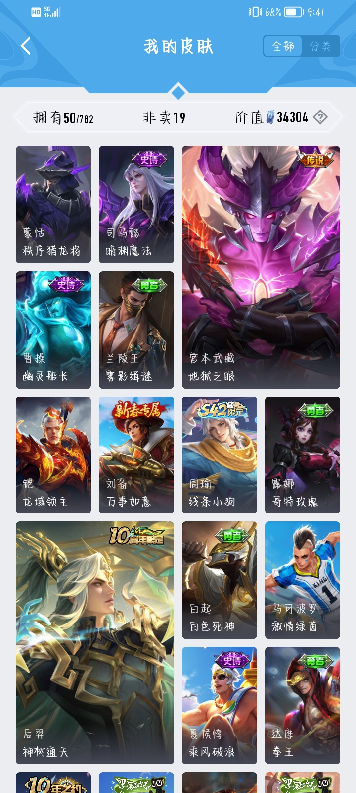 贵族10 荣耀典藏7 无双2 珍品传说2 传说皮肤57 史诗皮肤161 皮肤数量490