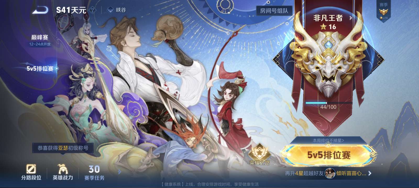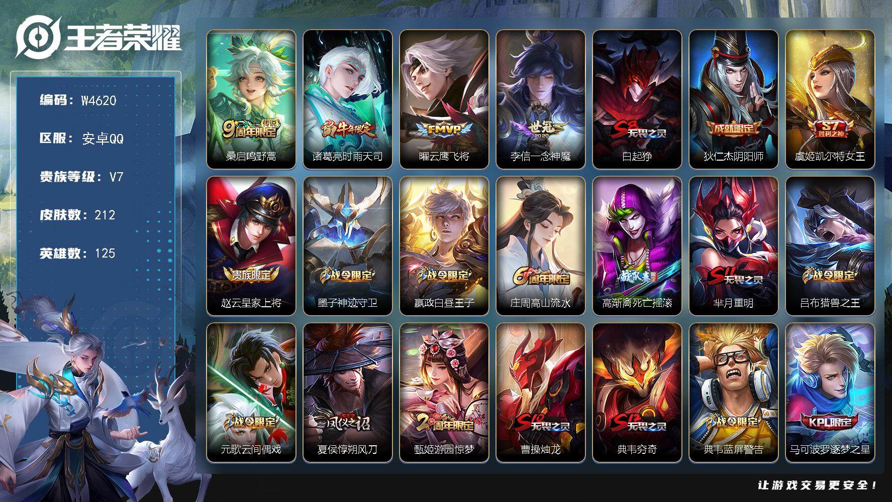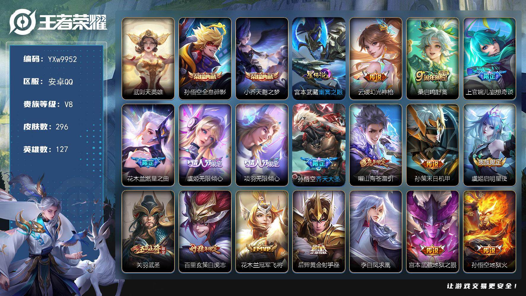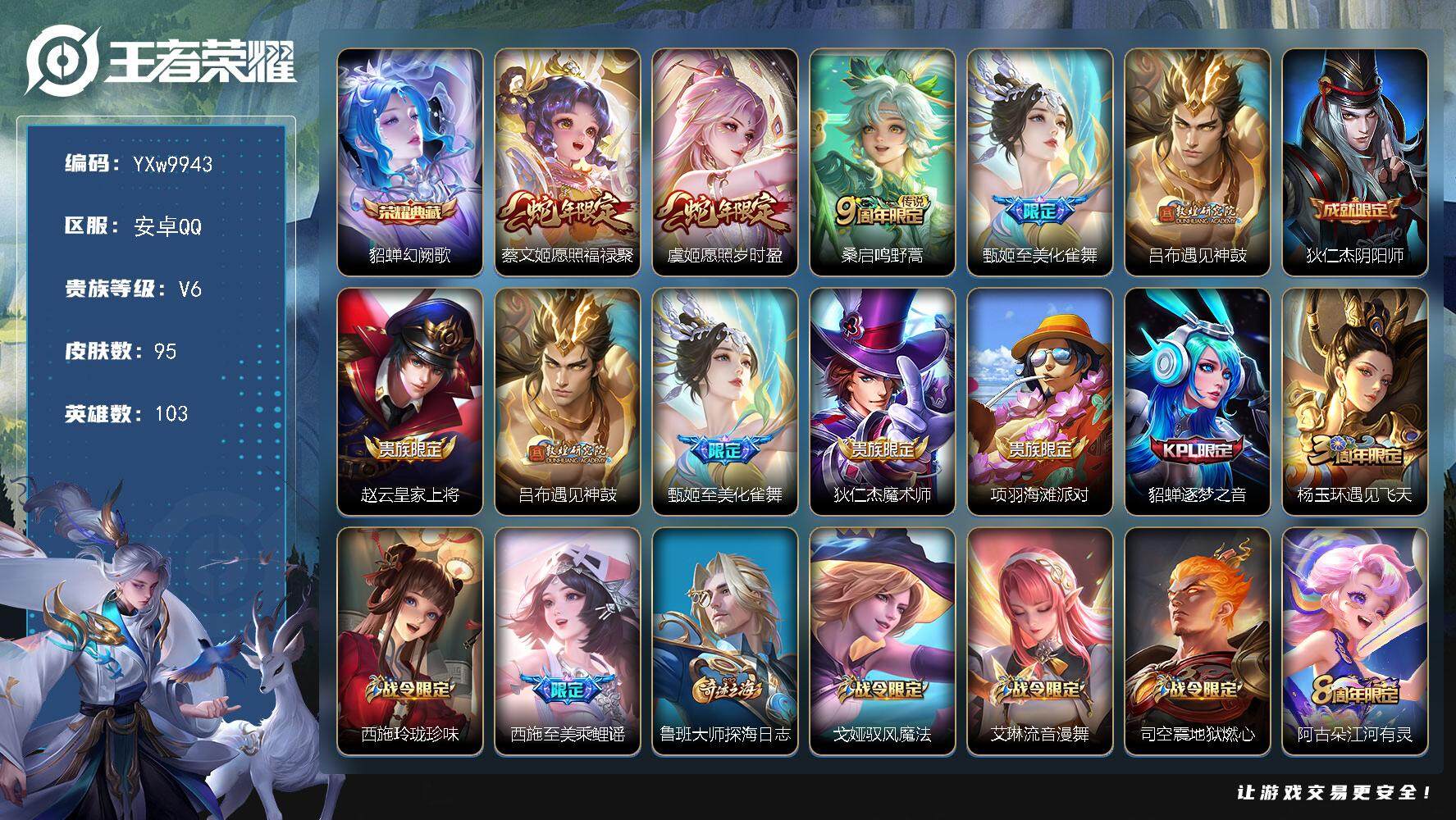 安卓Q-V6-最强王者段位-95英雄-105皮肤-1无双-1珍品传说-11传说