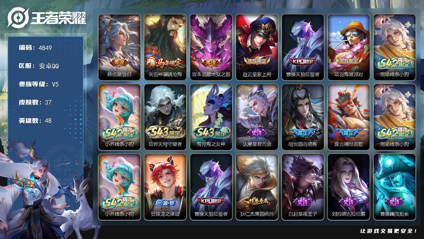 V7 1典藏 3珍品传说 15传说 110英雄 120皮肤 可二次 可修改实名