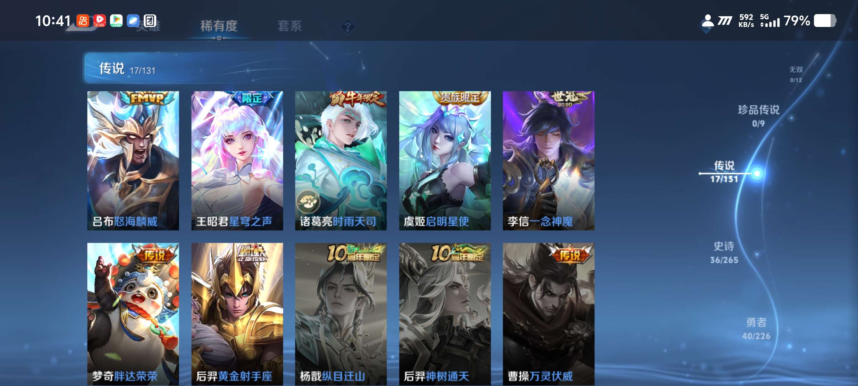 安卓QQ/无双王者/117皮肤/115英雄/1典藏/0珍品无双/1无双/0珍品传说/9传说/24史诗