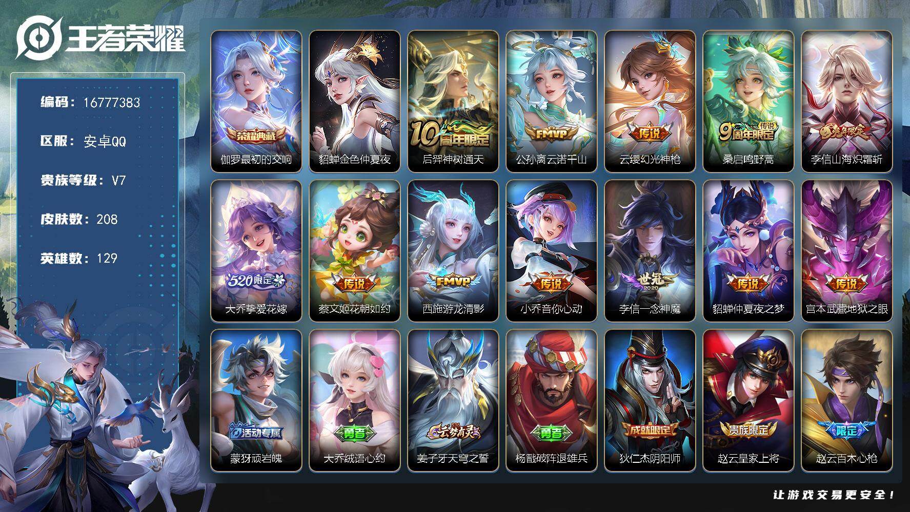 129英雄-216皮肤-安卓QQ/v8精品公主号/全皮瑶-