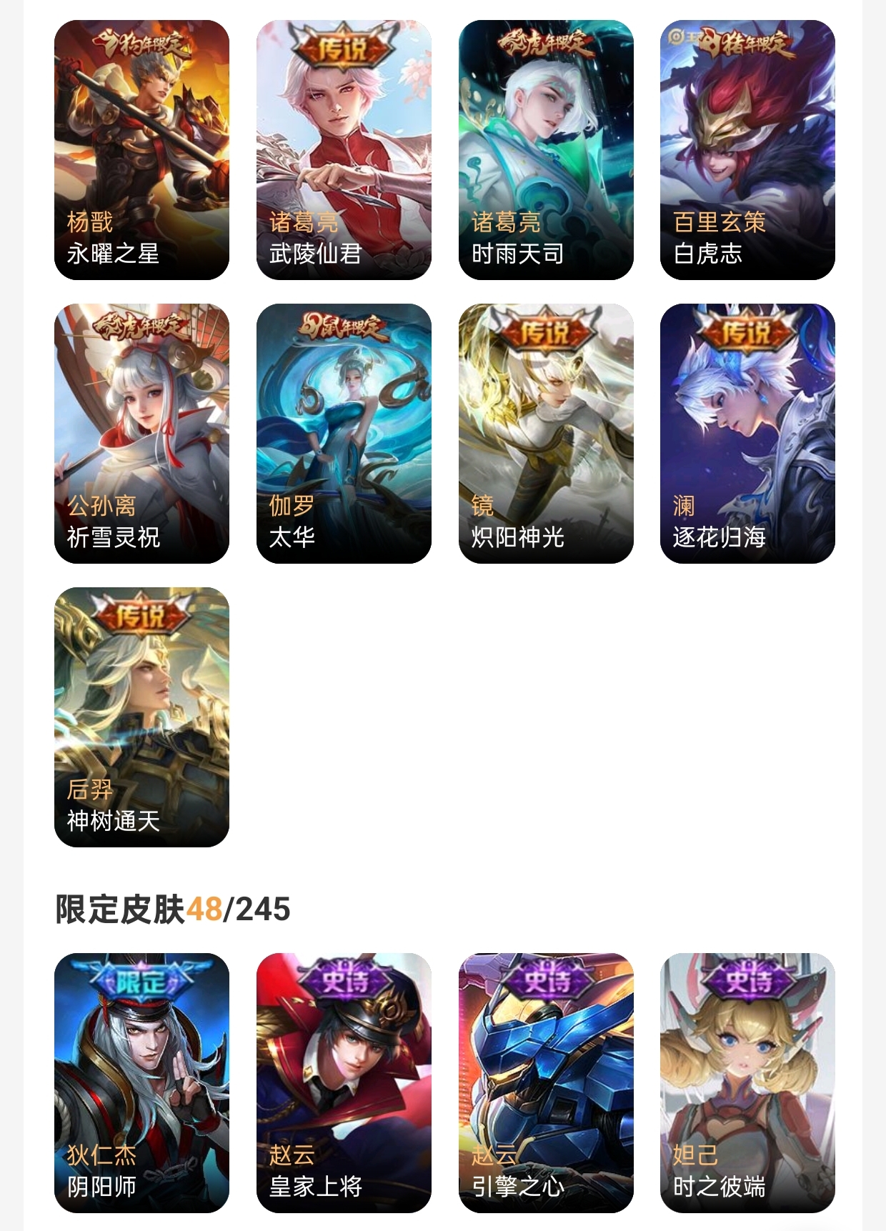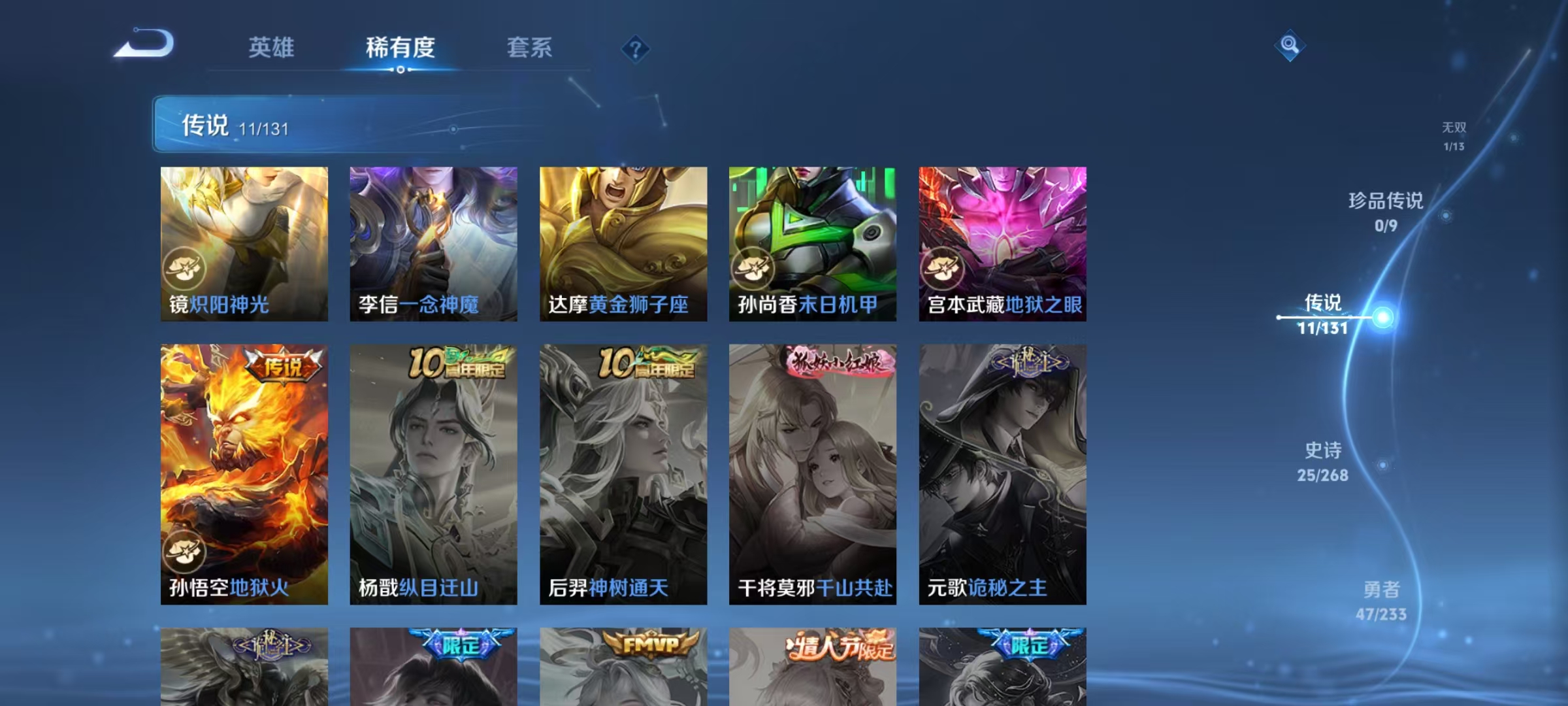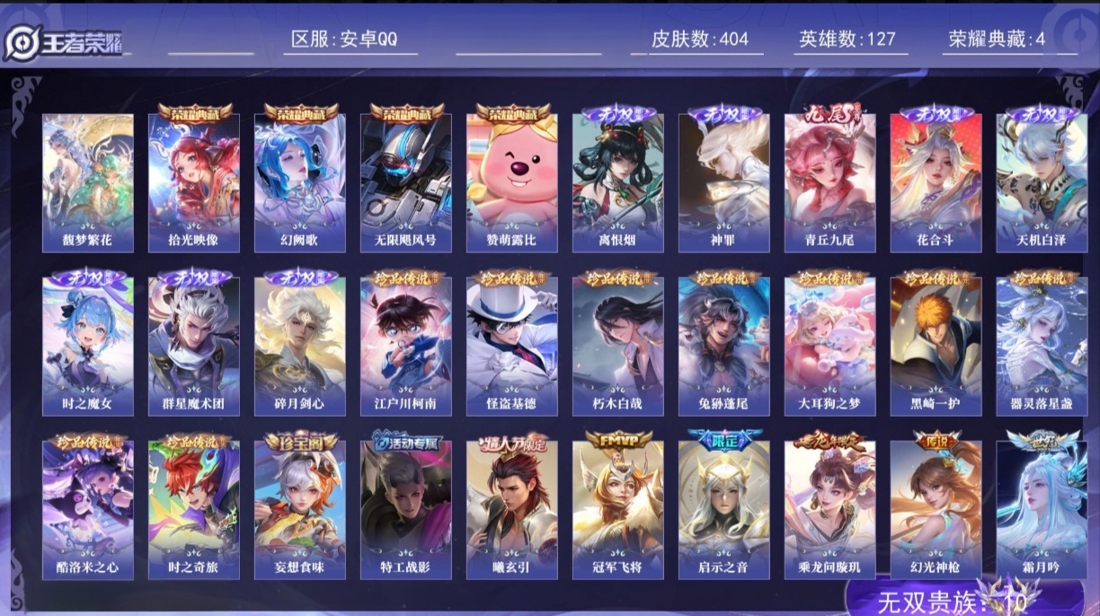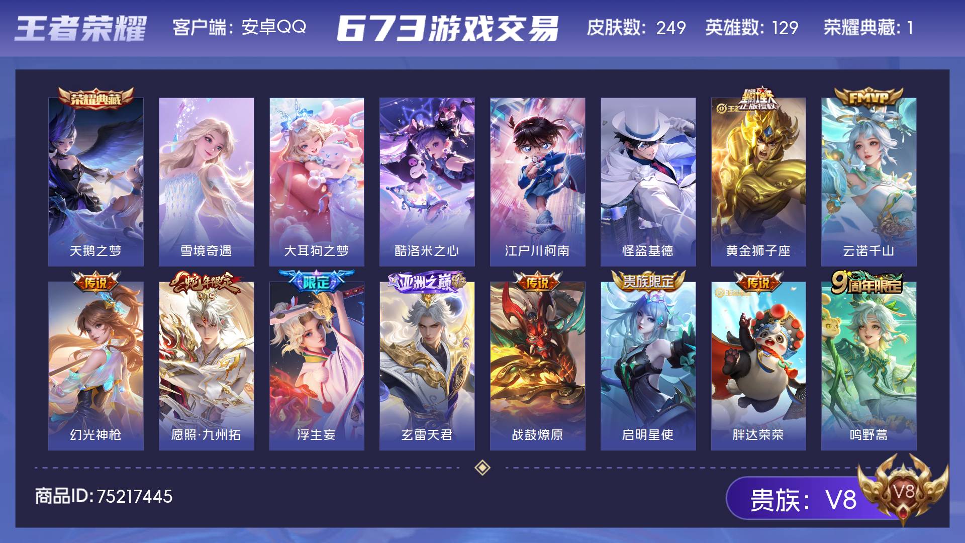 V8 皮肤249 英雄129 至尊星耀 荣耀典藏1 无双皮肤1 珍品传说4 星传说1 传说22 其他皮肤227