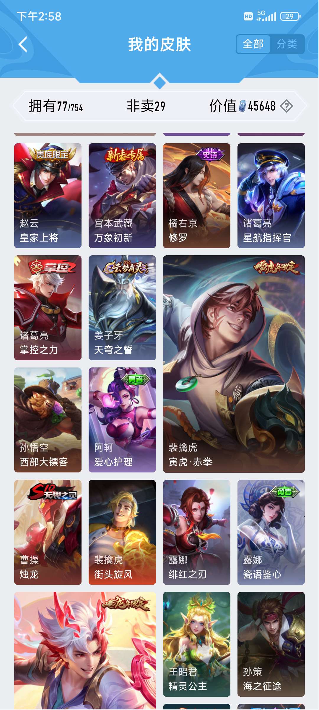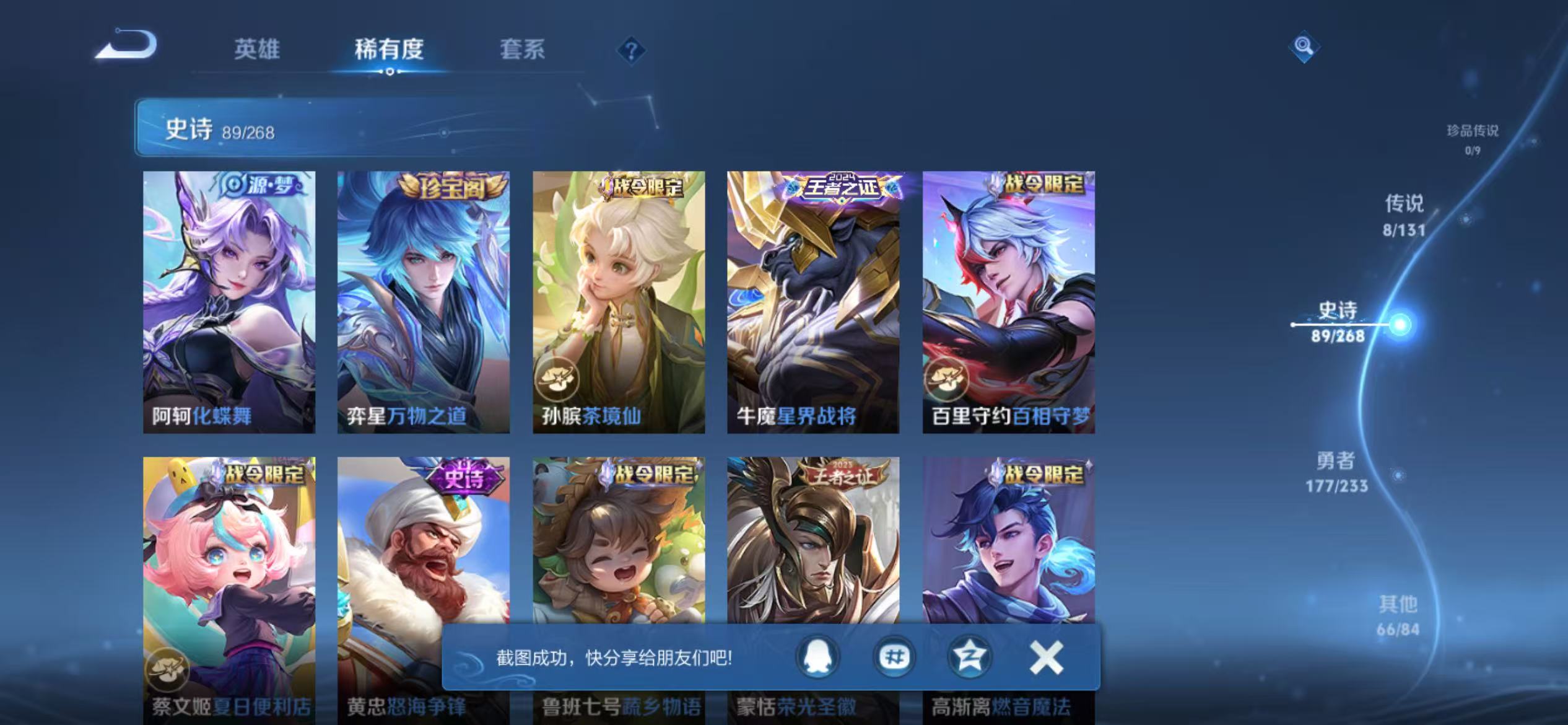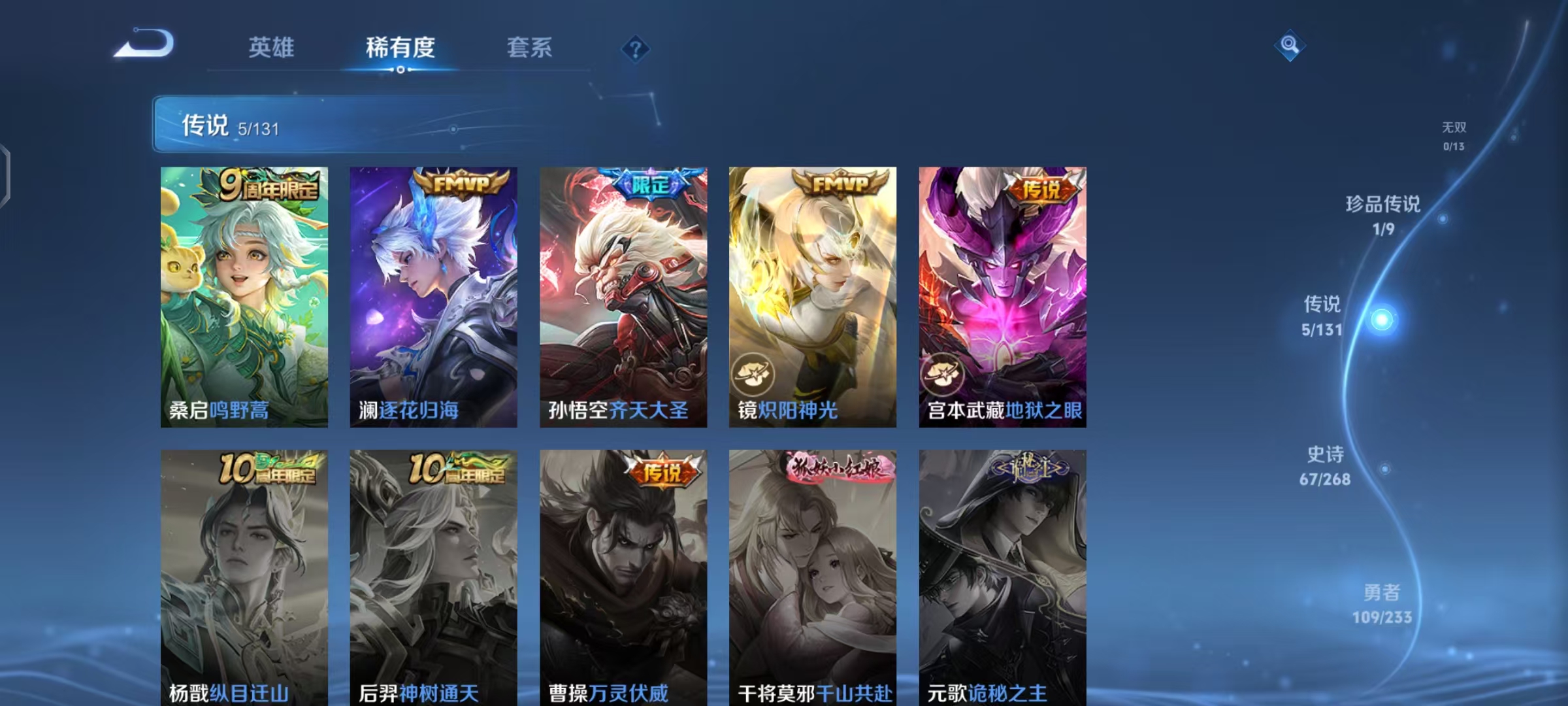 V8 皮肤249 英雄129 至尊星耀 荣耀典藏1 无双皮肤1 珍品传说4 星传说1 传说22 其他皮肤227