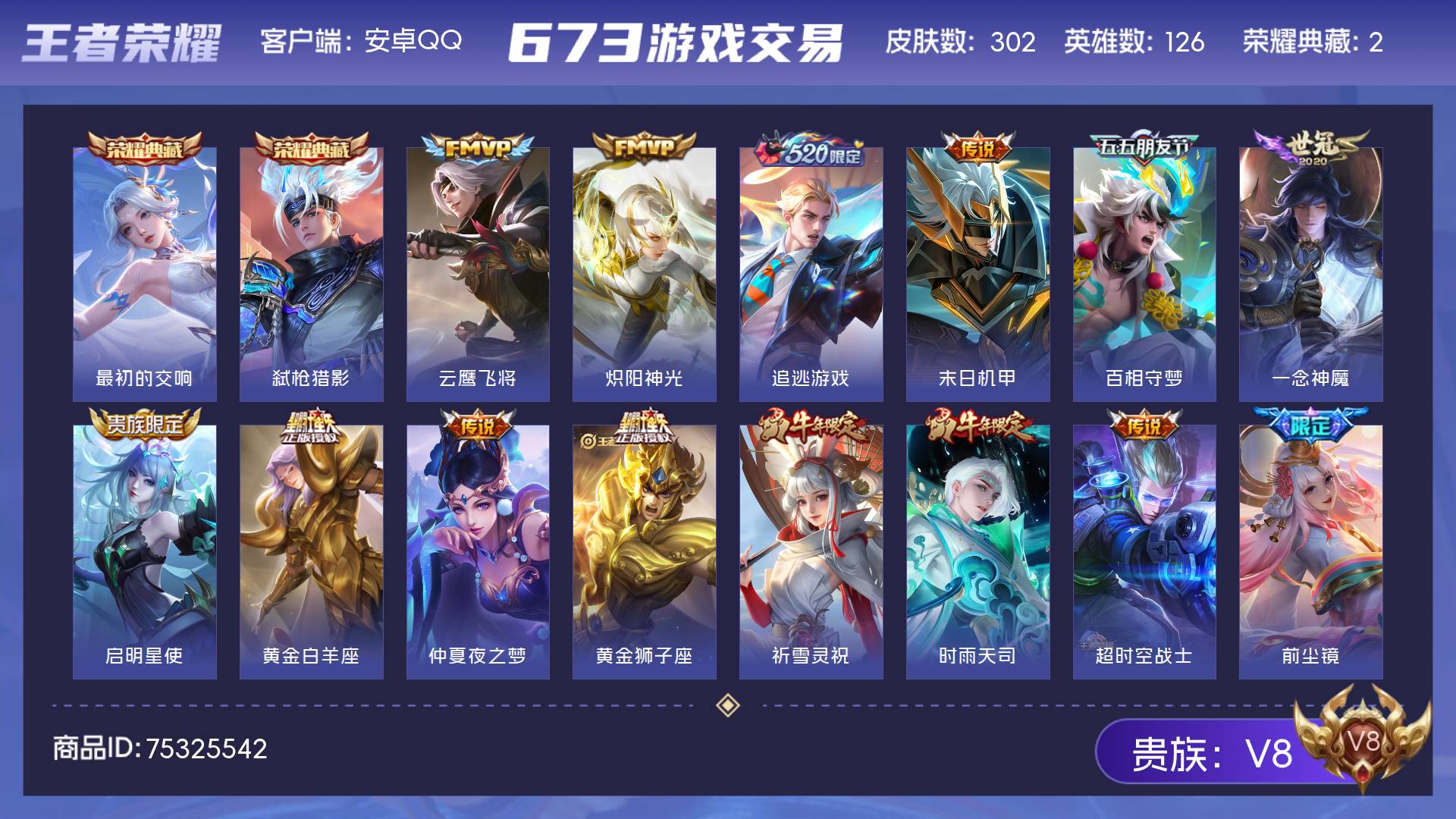 安卓Q可二次 V8 皮肤302 英雄126 至尊星耀 荣耀典藏2 传说24 史诗82 多限定质量号
