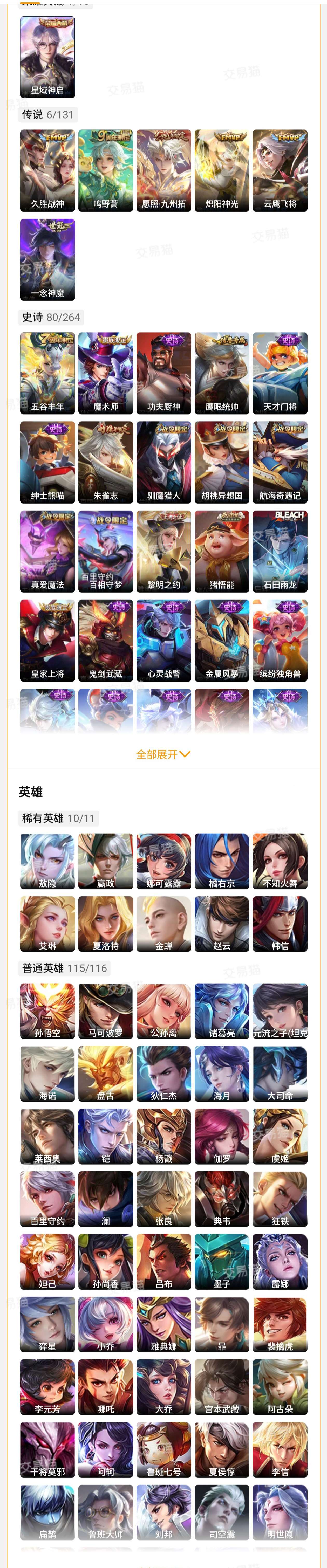 王者荣耀【安卓QQ】珍品传说1 无双3 典藏6 传说53 史诗161