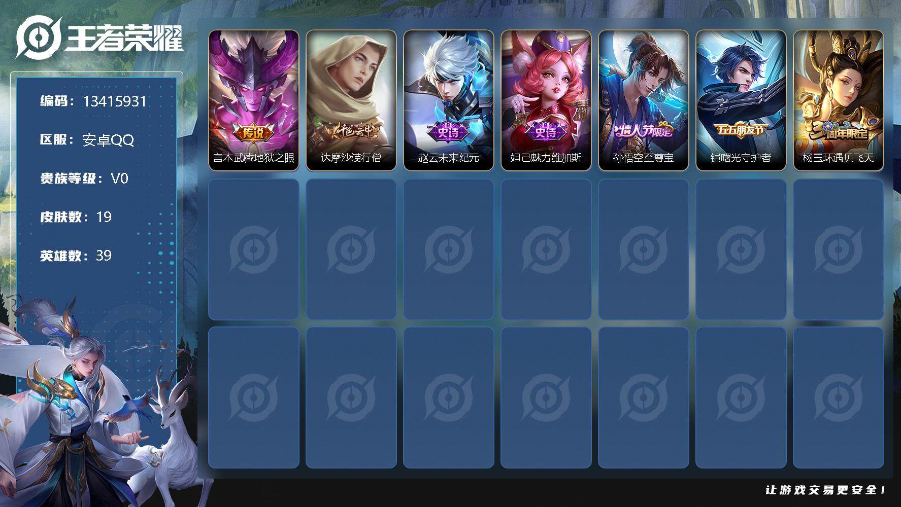 王者荣耀【安卓QQ】【13415931】[13415931]实名: 可修改 英雄数: 39 皮肤数