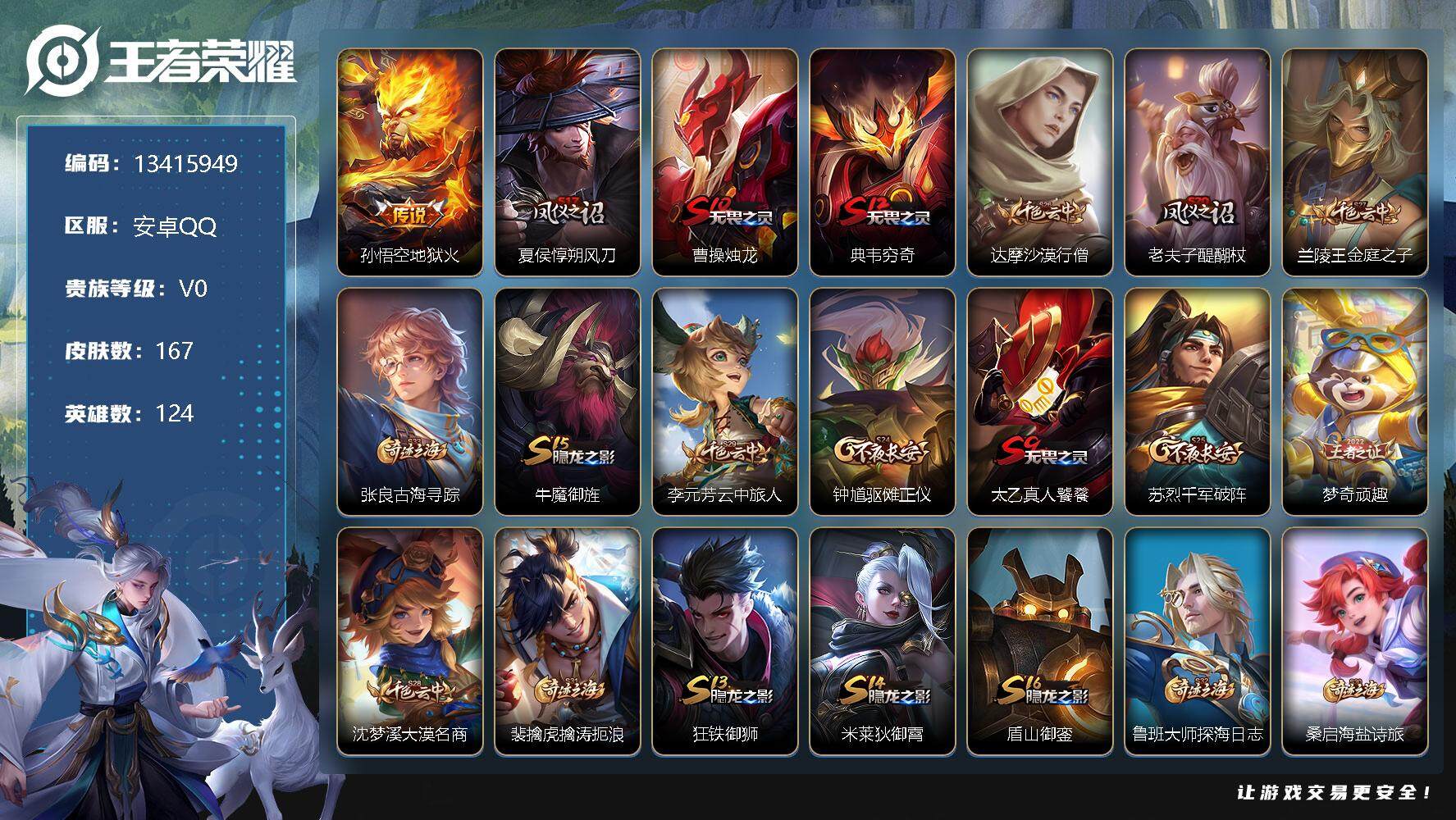王者荣耀【安卓QQ】【13415949】[13415949]实名: 不可修改 英雄数: 124 皮