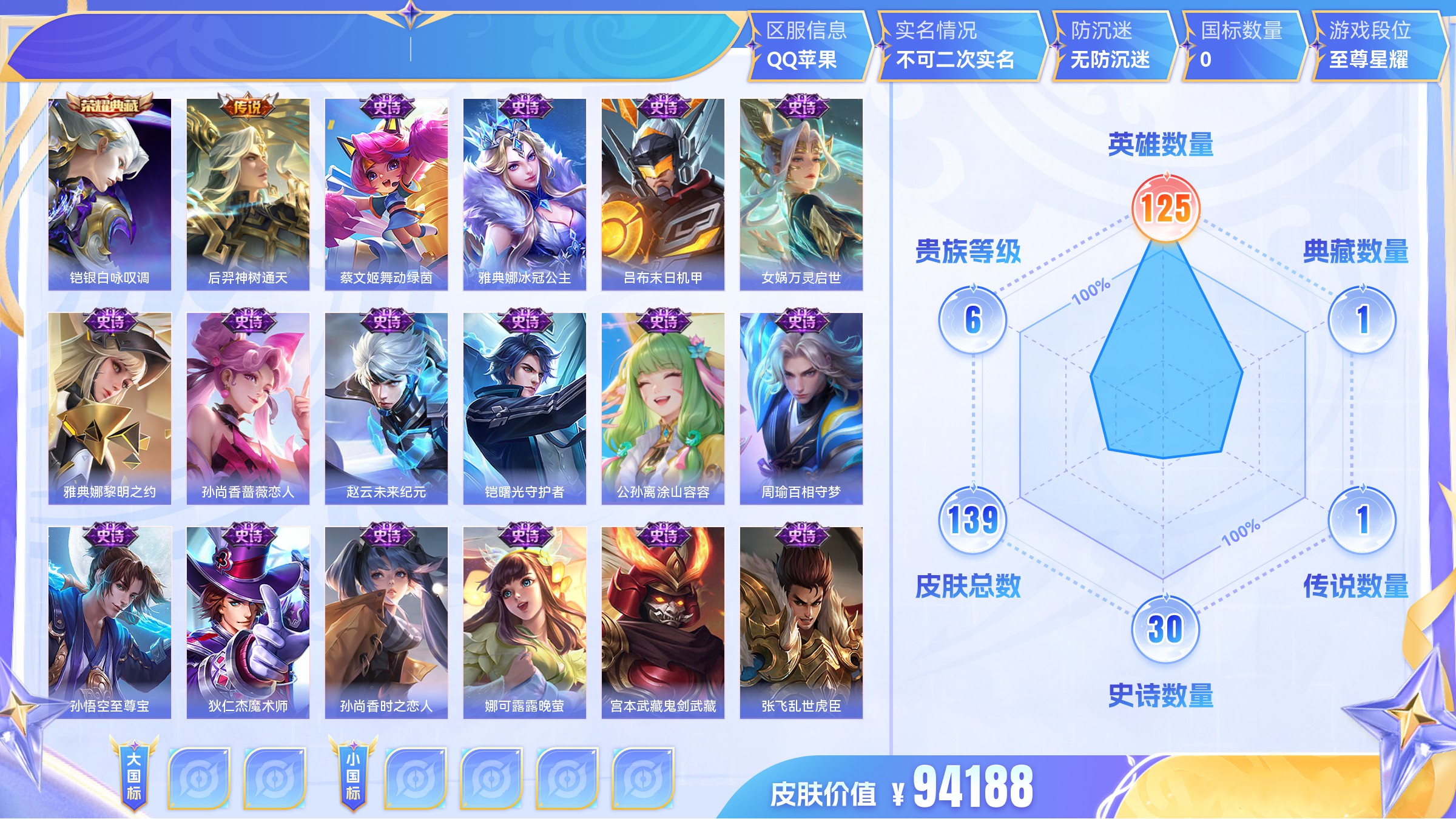 王者荣耀【苹果QQ】典藏1 传说1 史诗30 限定44 英雄125