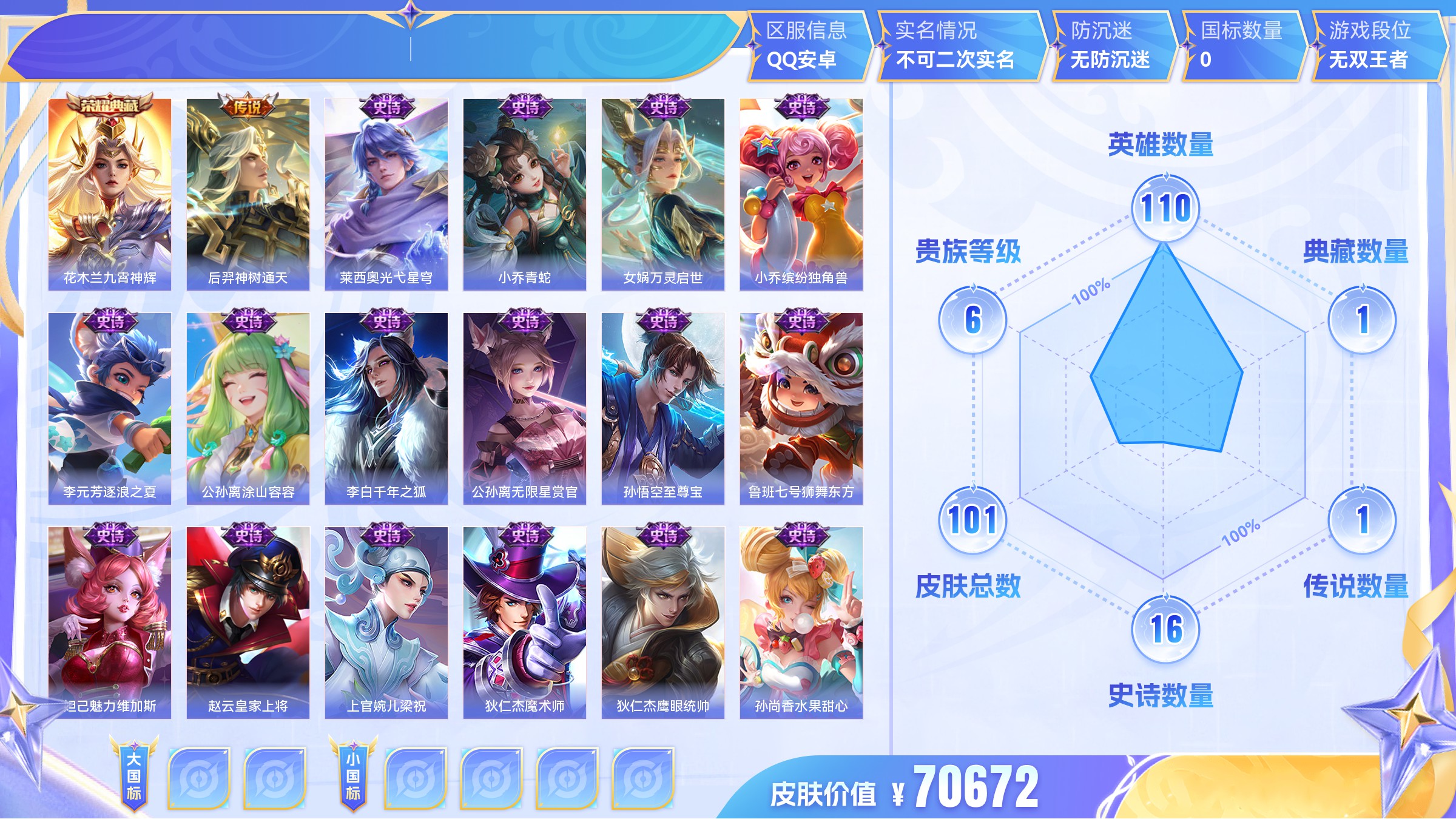 王者荣耀【安卓QQ】典藏1 传说1 史诗16 限定32 英雄110
