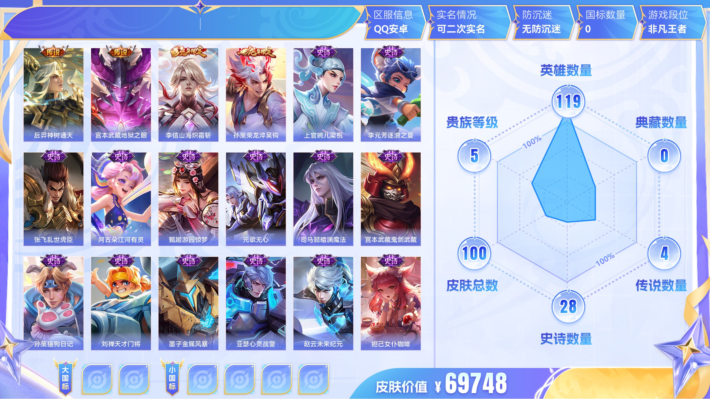 王者荣耀【安卓QQ】传说4 史诗28 限定34 英雄119 皮肤100
